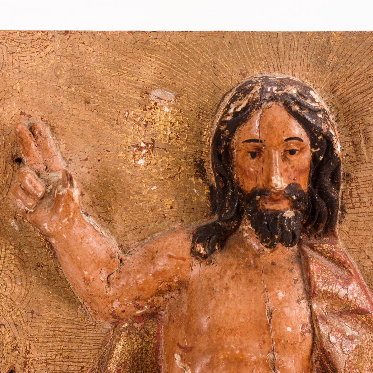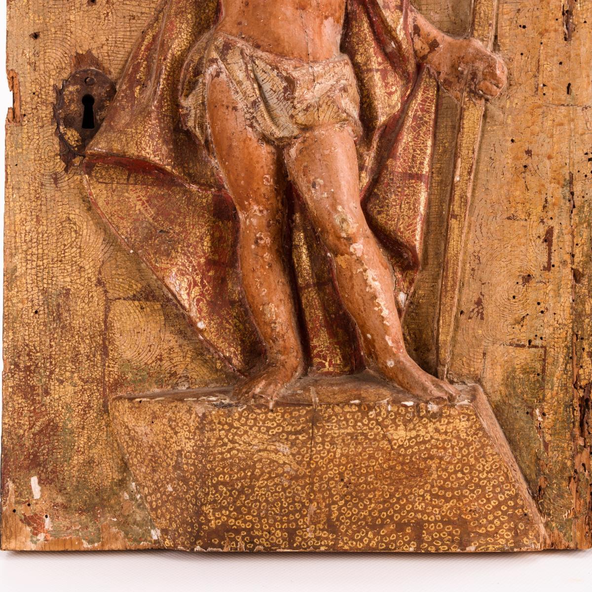 Wohl von einem Tabernakel stammende Tür mit dem Hochrelief des auferstandenen Christus im Brokatmantel und mit Triumphkreuz. Aus einem Stück zusammen mit dem Türblatt geschnitzt; originales Schloss ohne Schlüssel. Auf dem roten Mantel original erhaltene Ornamentmalerei in Gold. Der vergoldete Hintergrund und Sockel wurde eventuell original beige übermalt und die Kreis- und Strahlenornamente wieder ausradiert. Anobienspuren mit Klebe- und Fehlstellen am Rand, kaum Trockenrisse, stärkere Alters-/Gebrauchsspuren.