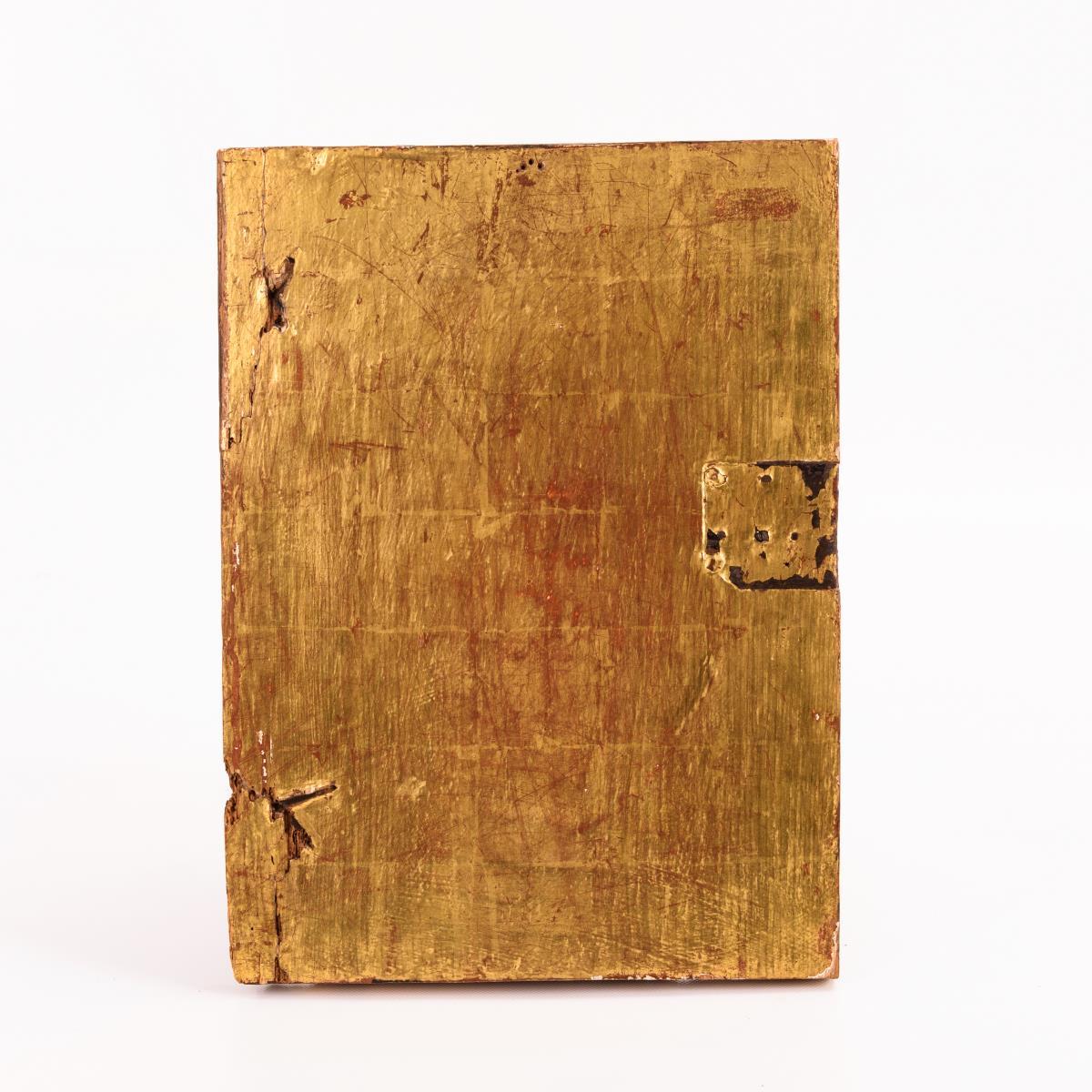 Nadelholz polychrom gefasst und vergoldet, Rückseite vergoldet. Originalfassung großteils erhalten. 42 x 31 x 6 cm.
