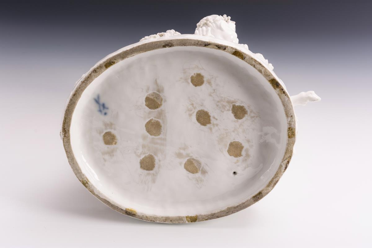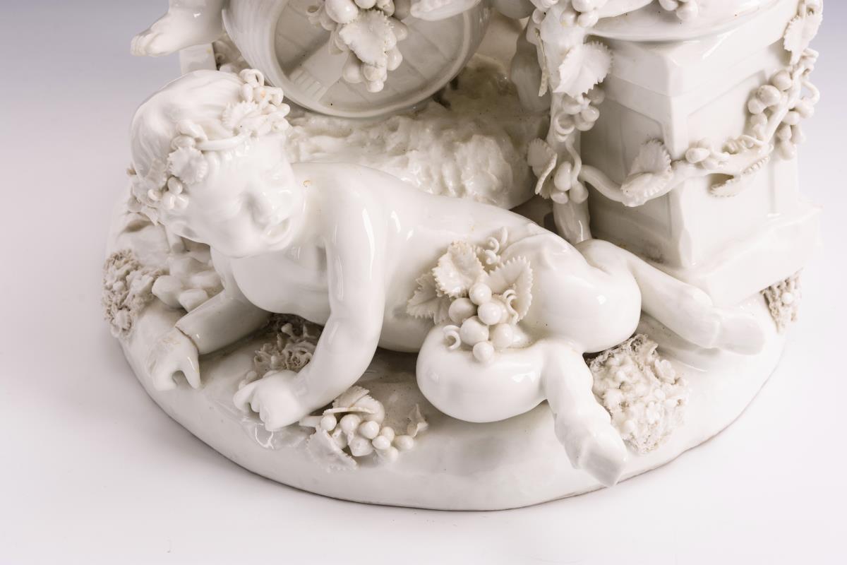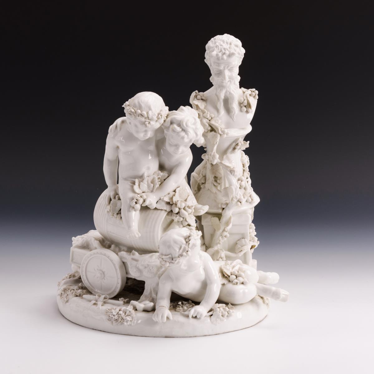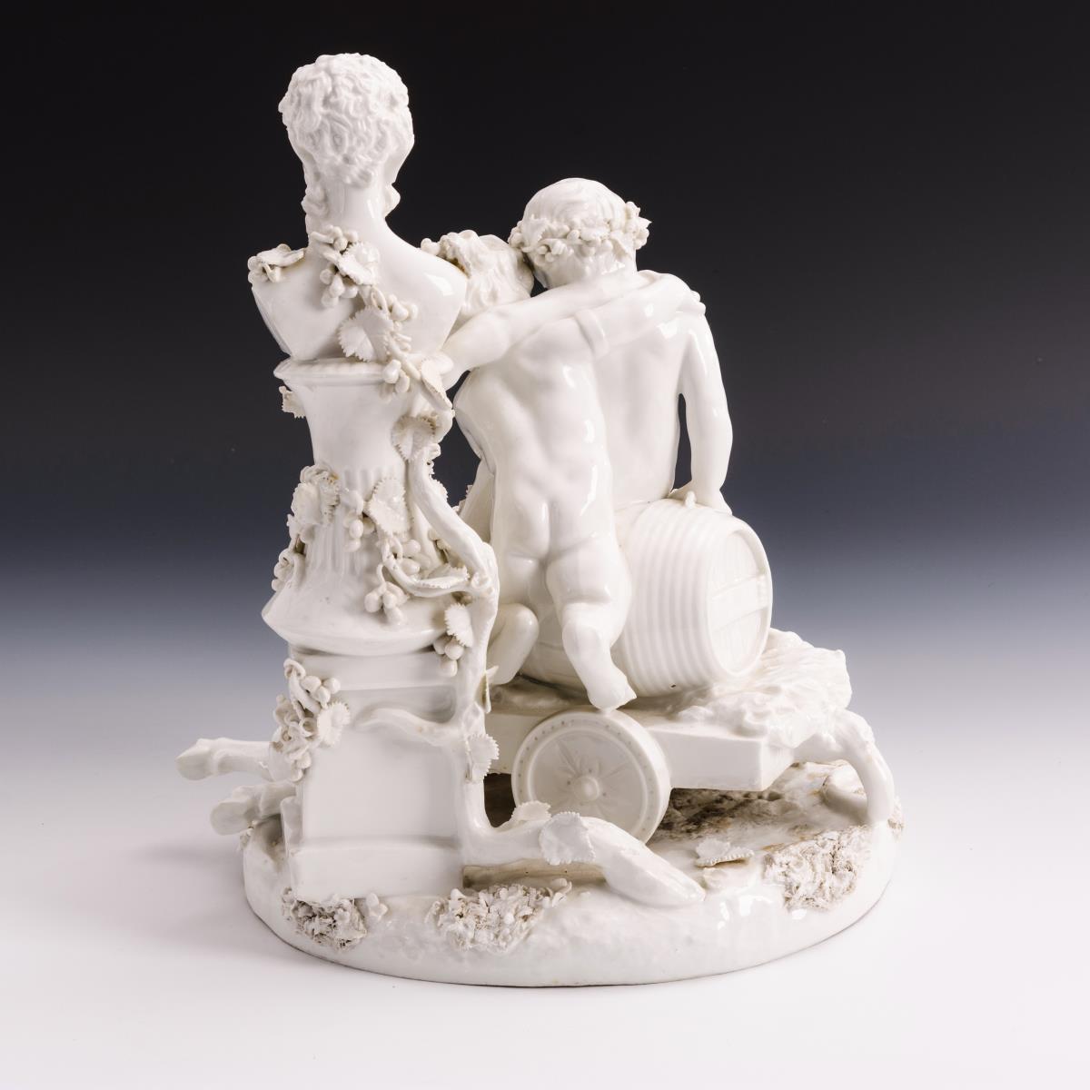 Ein Putto und ein Faunsknabe auf einem Weinfass neben einer Faunsbüste sitzend, zu ihren Füßen ein Faunsknabe liegend. Weinblätter partiell sowie 1 Ast und 1 Huf restauriert, Brandriss in 1 Handgelenk, partiell Bestoßungen an den Blättern.