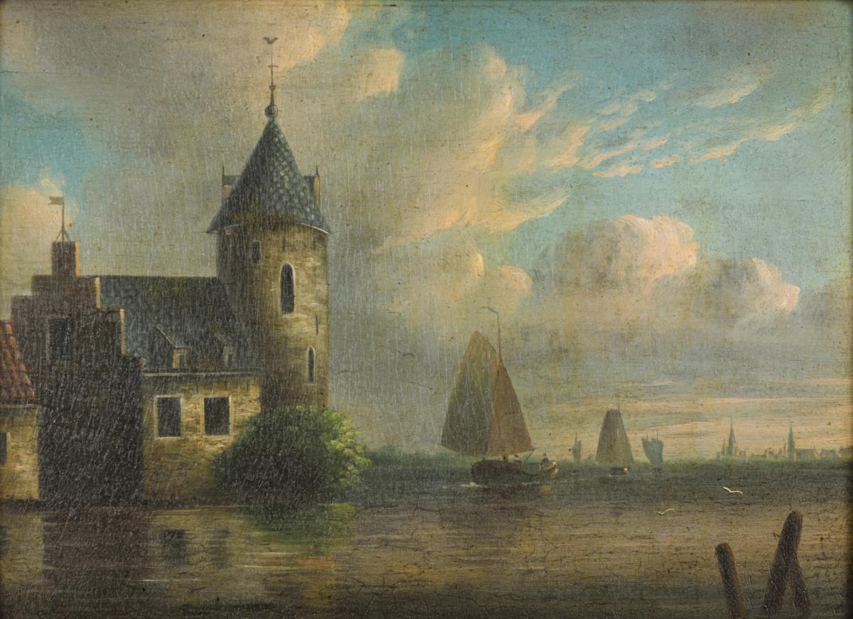 Weite Flusslandschaft mit Seglern und Kirche. Altersspuren.