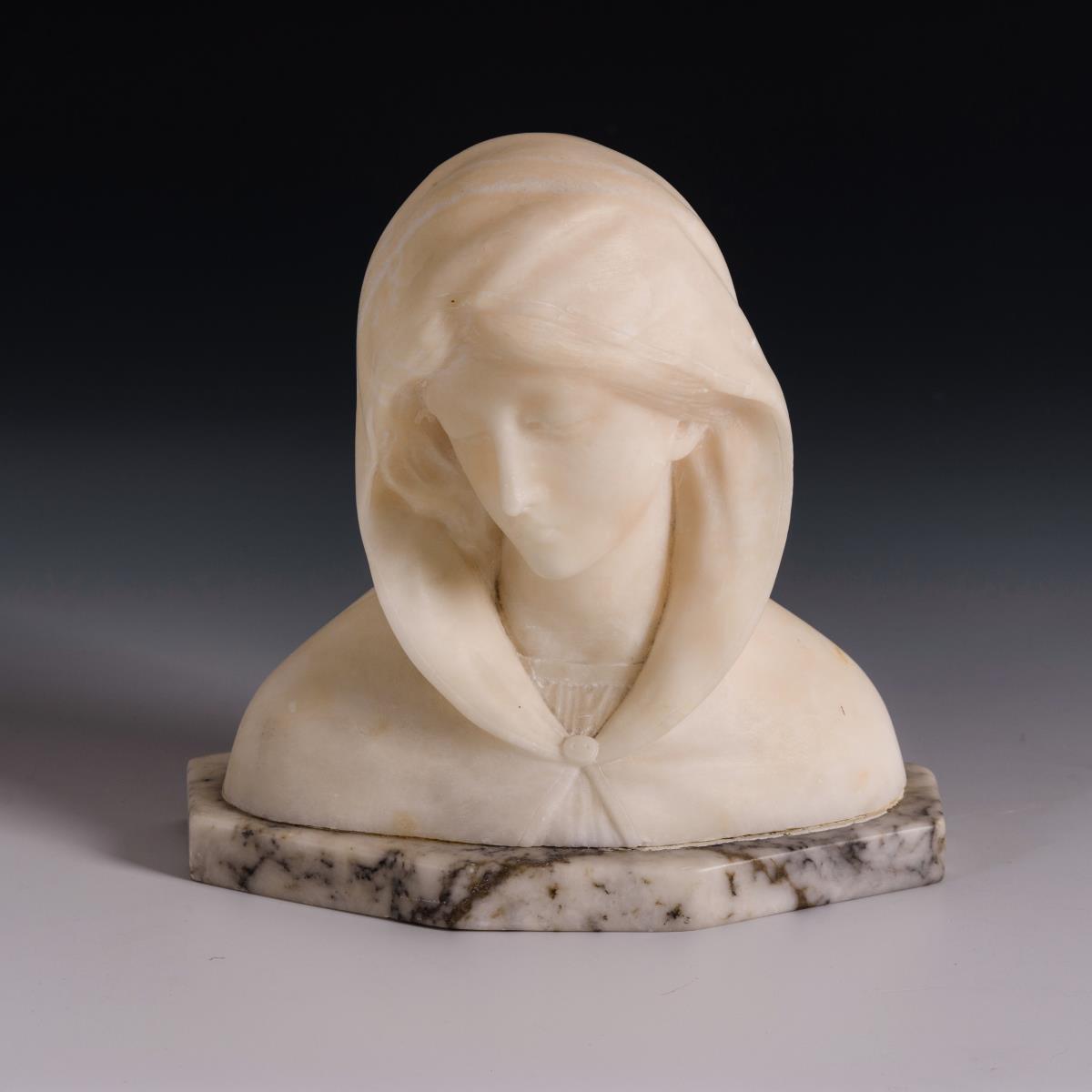 Alabaster, helle Marmor-Plinthe. 1. Hälfte 20. Jh. Bezeichnet mit undeutlichem Zusatz. H 13 / 14,5 cm.