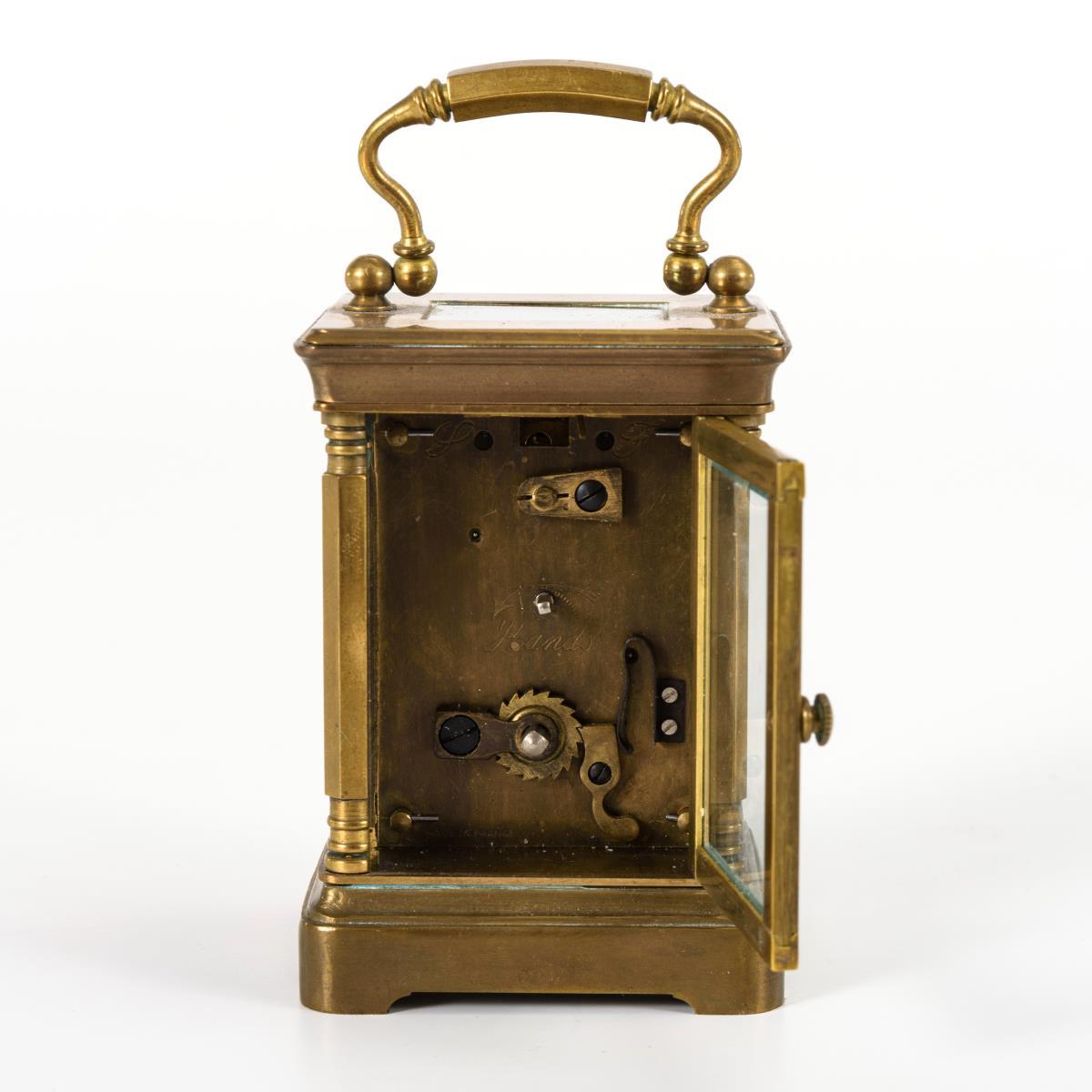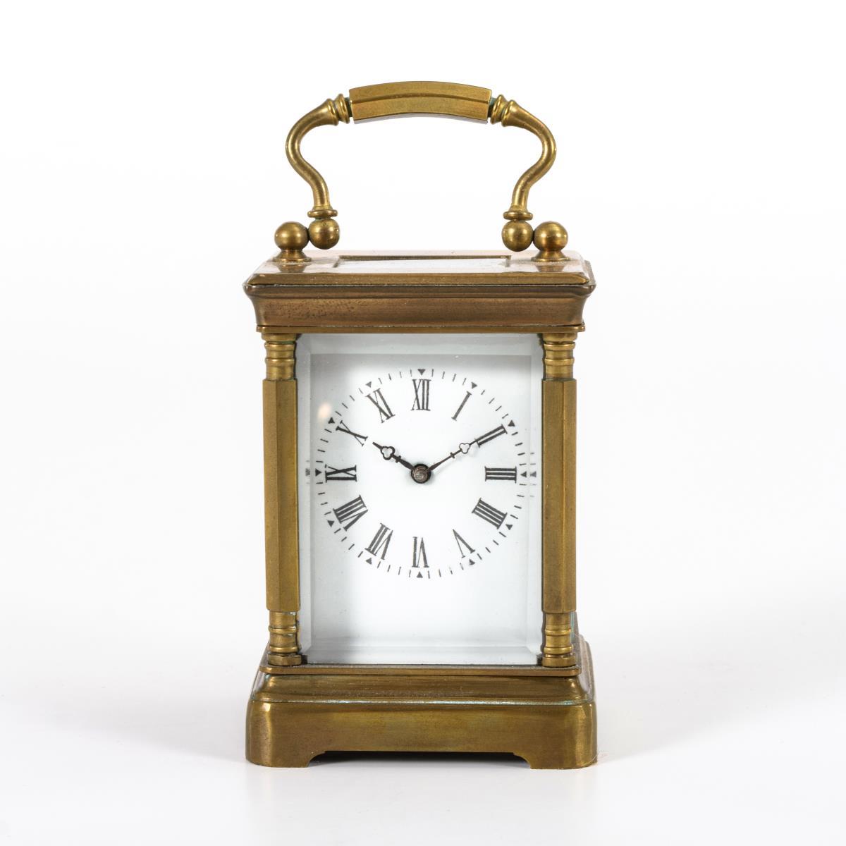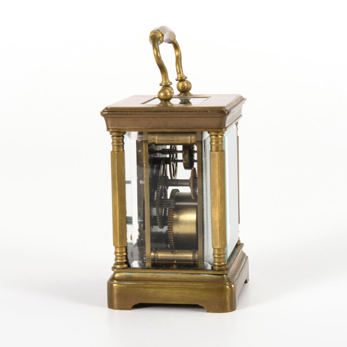 Allseitig facettiert verglastes Gehäuse mit profilierten Ecksäulchen und Bügelhenkel. Läuft.