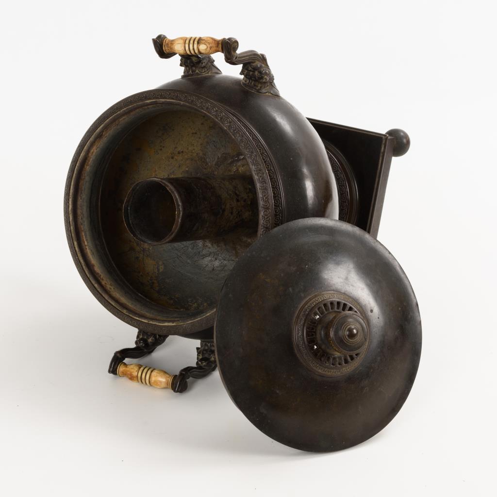Kupfer patiniert, innen verzinnt, Beingriffe.H 37 cm.