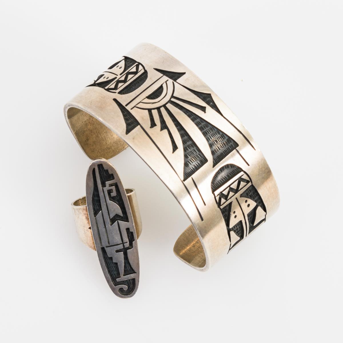 Offener, breiter Reif mit geschnittenen Motiven. Passender Ring mit breiter Schiene.
