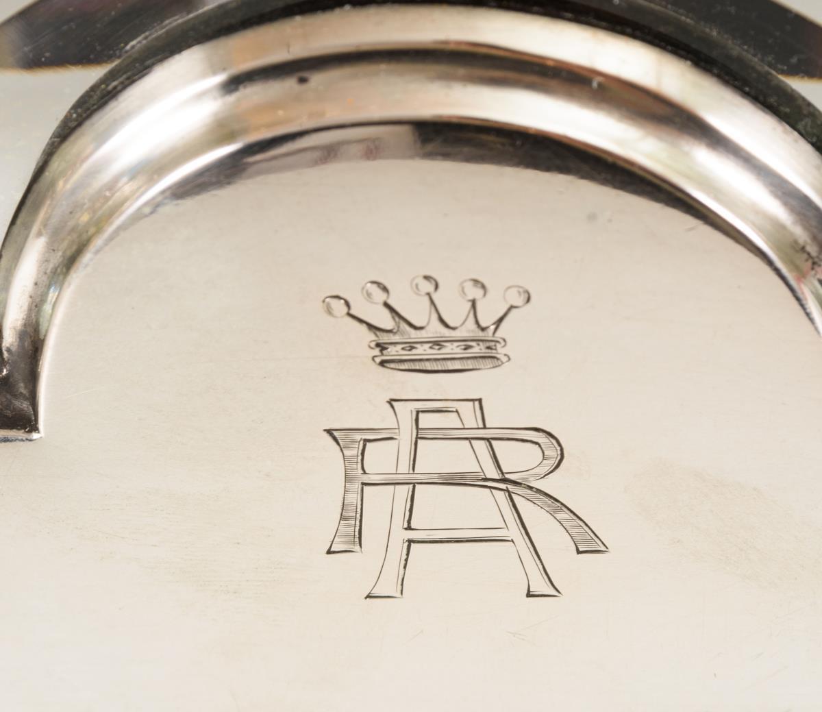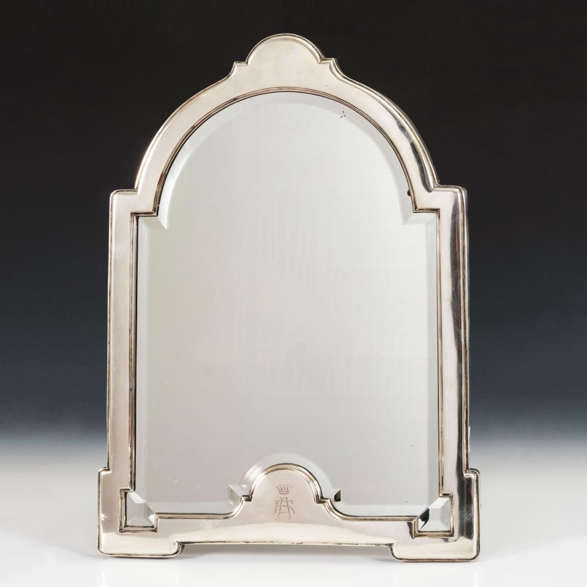 Eleganter Spiegel mit Facettenschliff und bekrönter Monogrammgravur: "AR". Kleine Dellen.