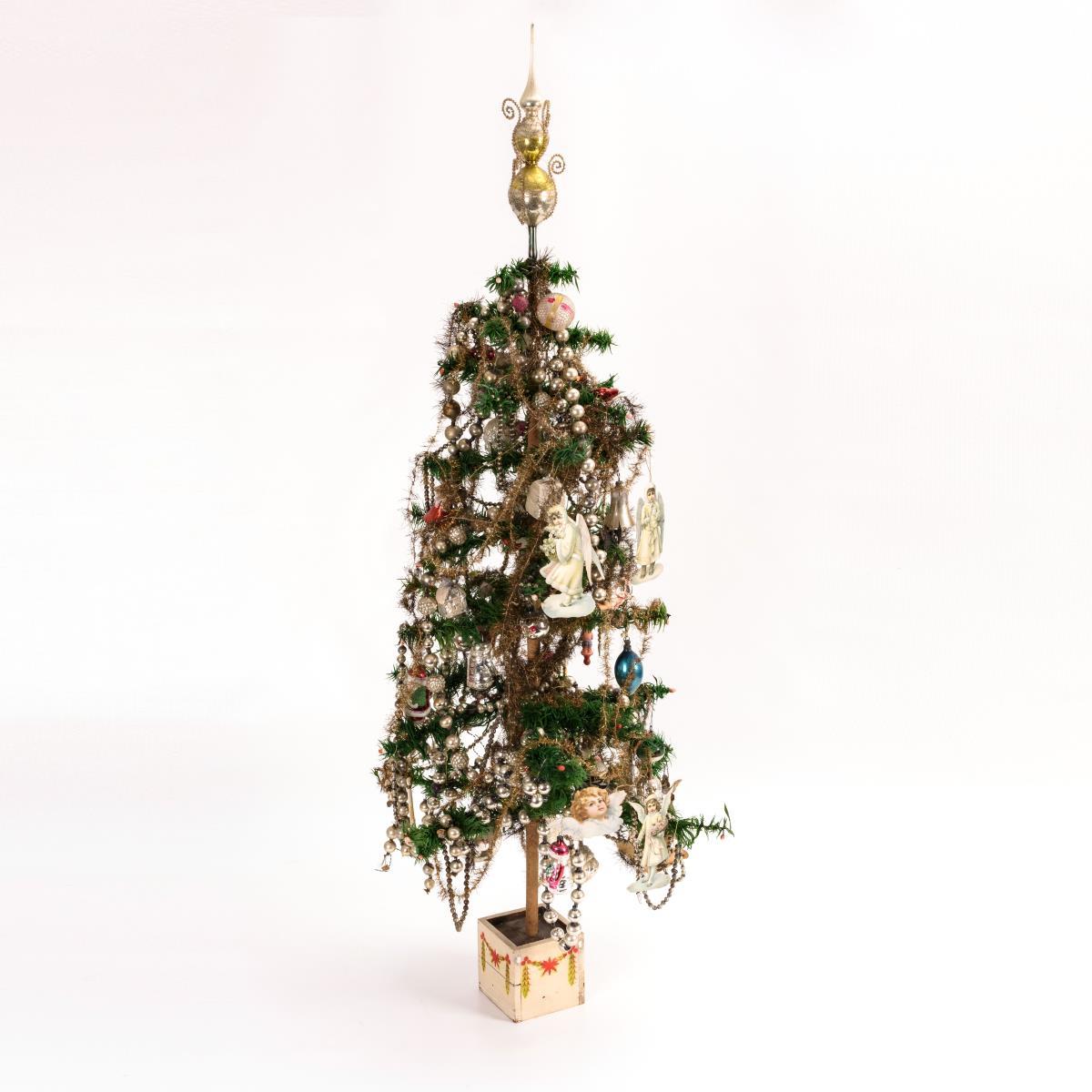 Außergewöhnlich großer Federbaum mit altem Christbaumschmuck.