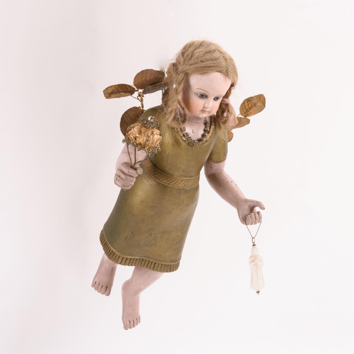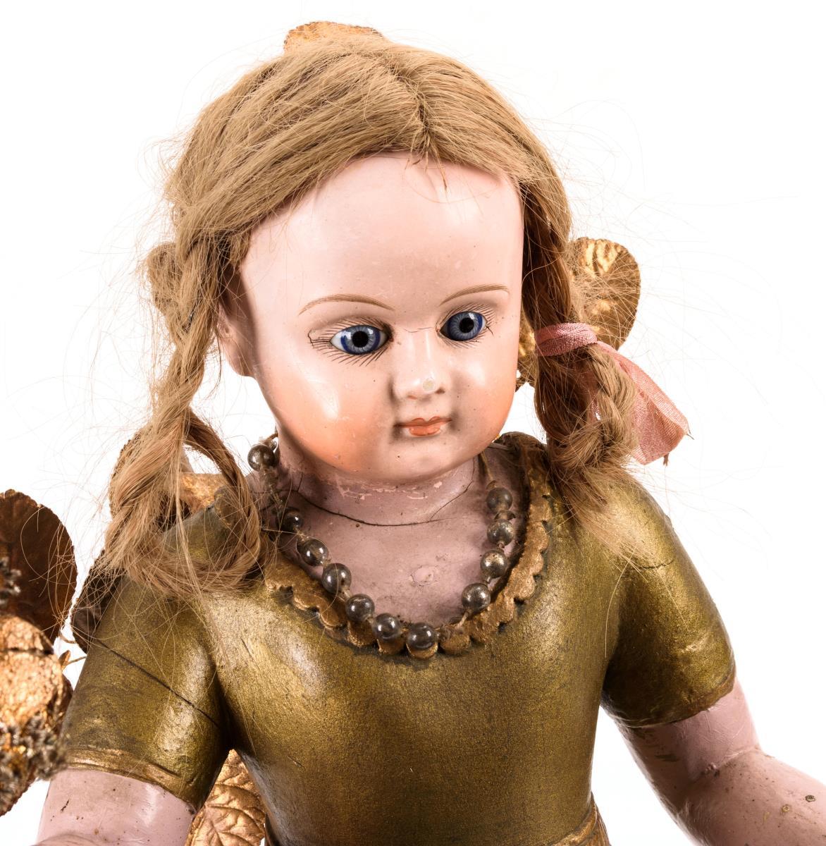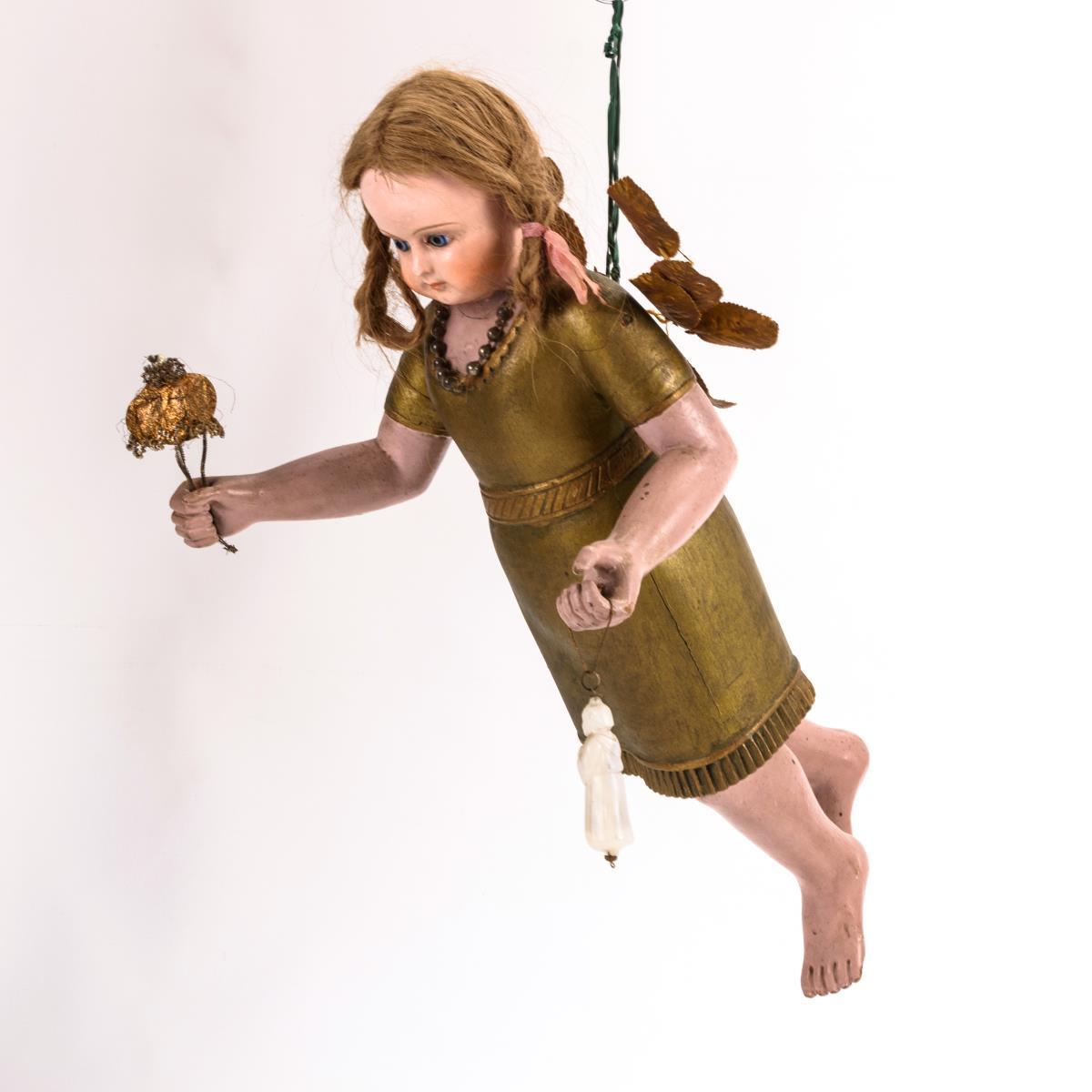Blonde Engelsfigur mit Puppenkopf, eingesetzten blauen Glasaugen und Echthaarperücke. Geschnitztes und goldbronziertes Gewand, in den Händen Baumschmuck aus Glas und Pappe haltend. Am Rücken Öse zur Aufhängung. Kleine Bestoßungen und Farbdefekte.