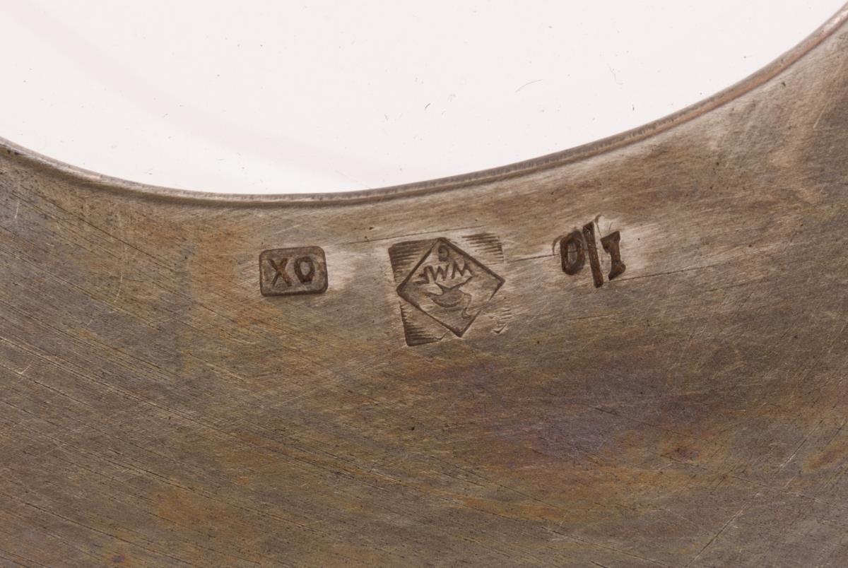 Längsovale Blumenschale mit stilisiertem Ornament- und Blütenzweig-Relief (Tränendes Herz) sowie hochgezogenen Handhaben. Originaler Glaseinsatz. Versilberung entfernt.