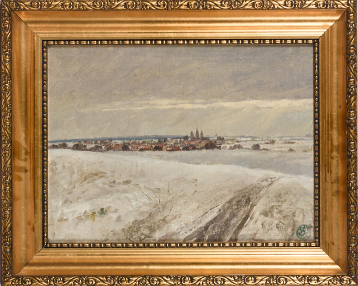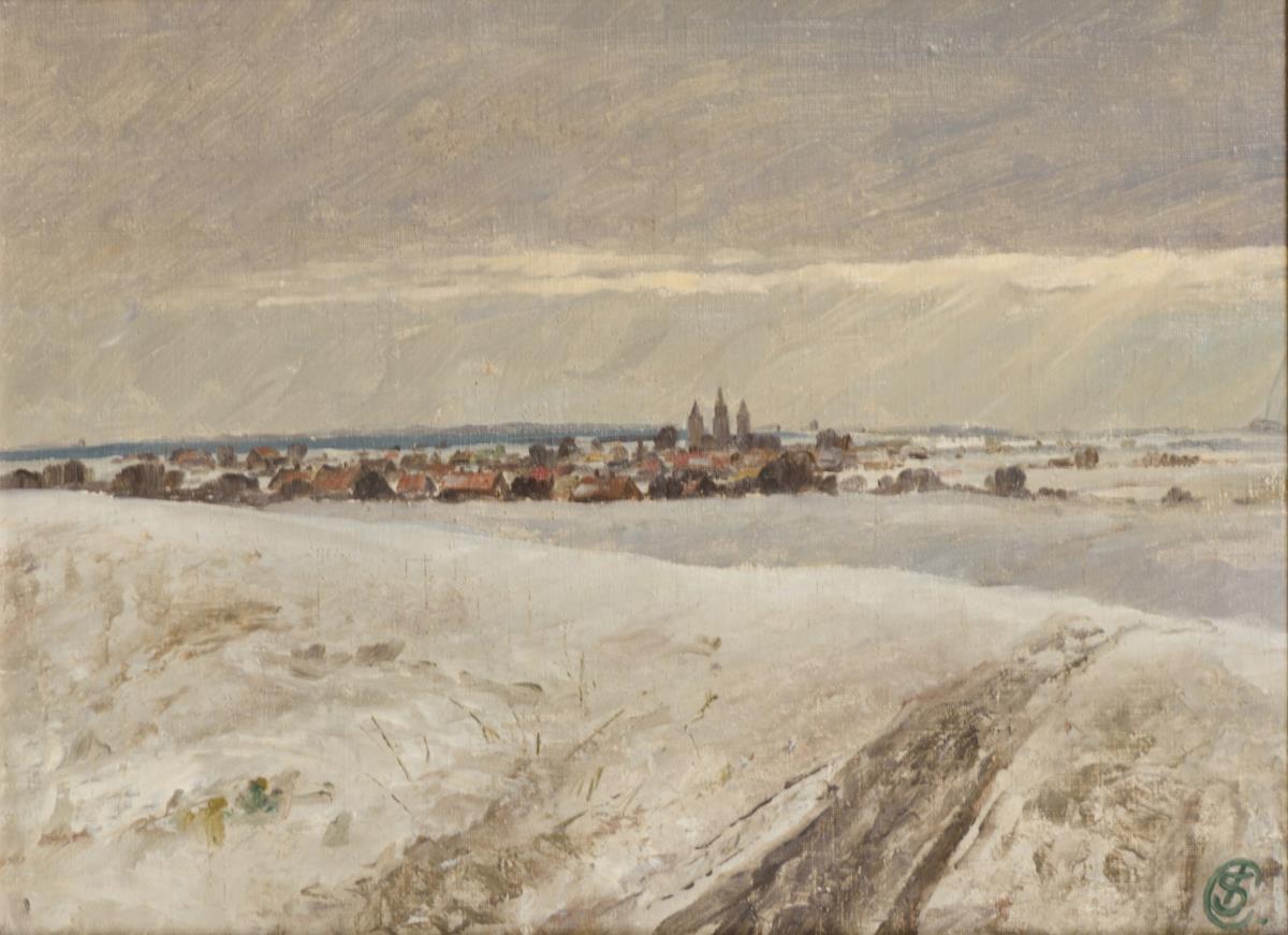 Vedute einer Stadt mit Dom in verschneiter Landschaft unter grauem Himmel.