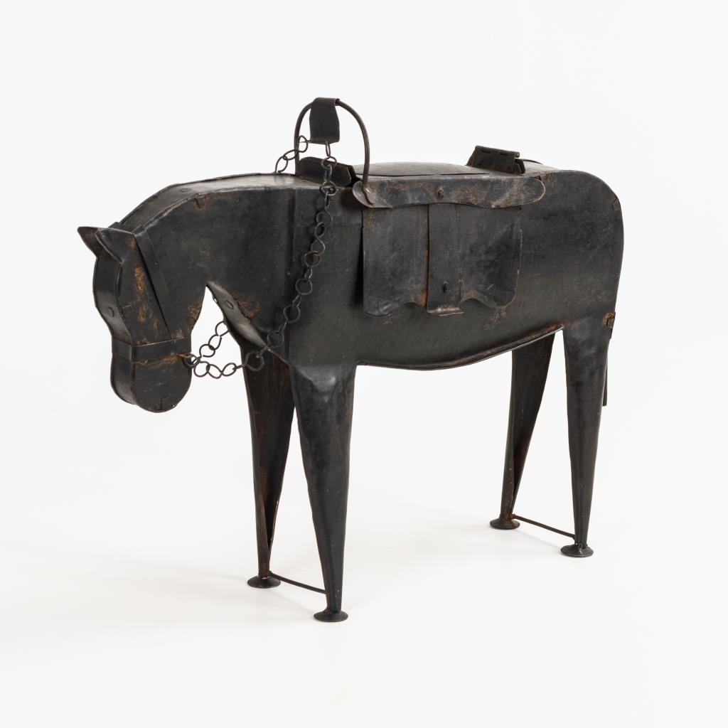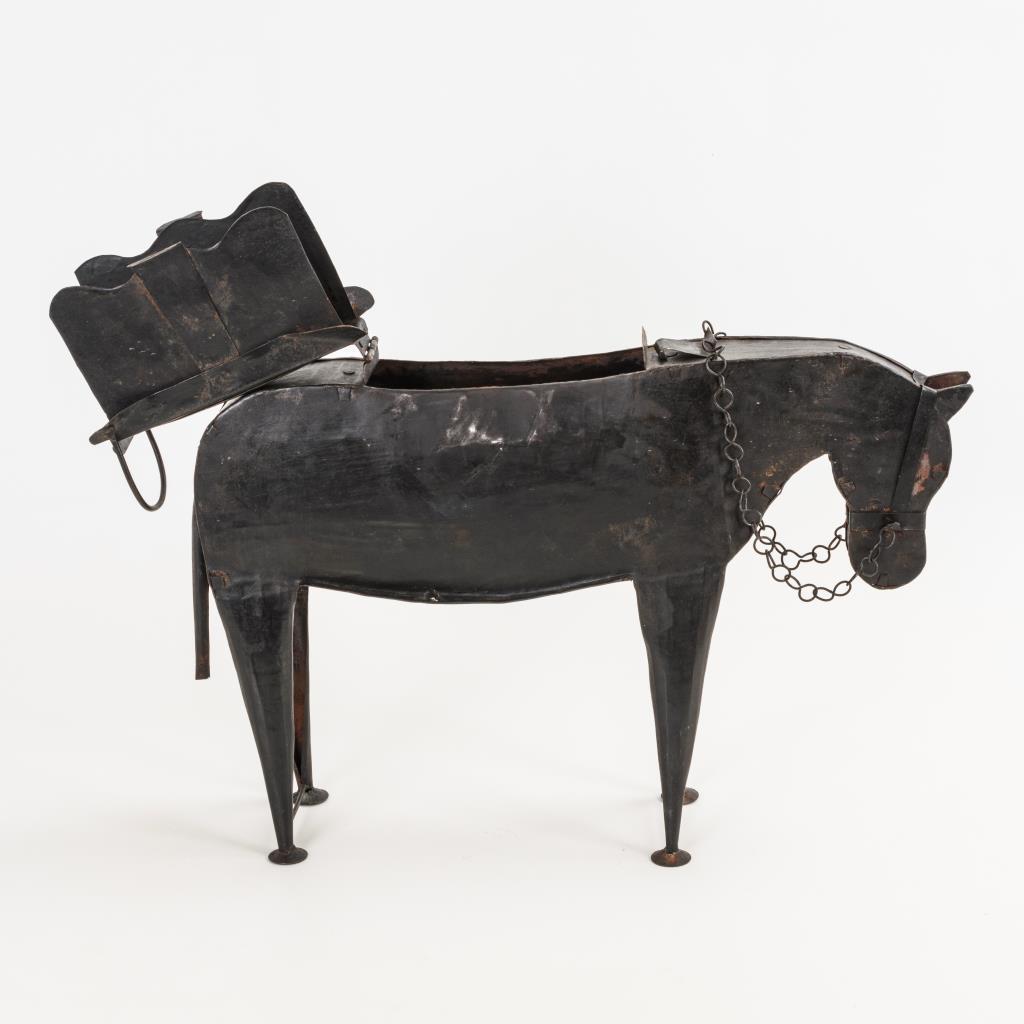 Stehendes Pferd mit Zaumzeugkette. Hochklappbarer Sattel als Dosendeckel. Geringer Rost.
