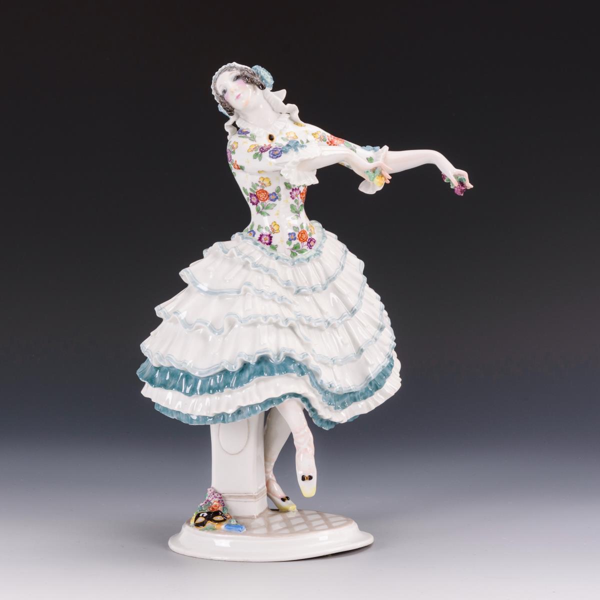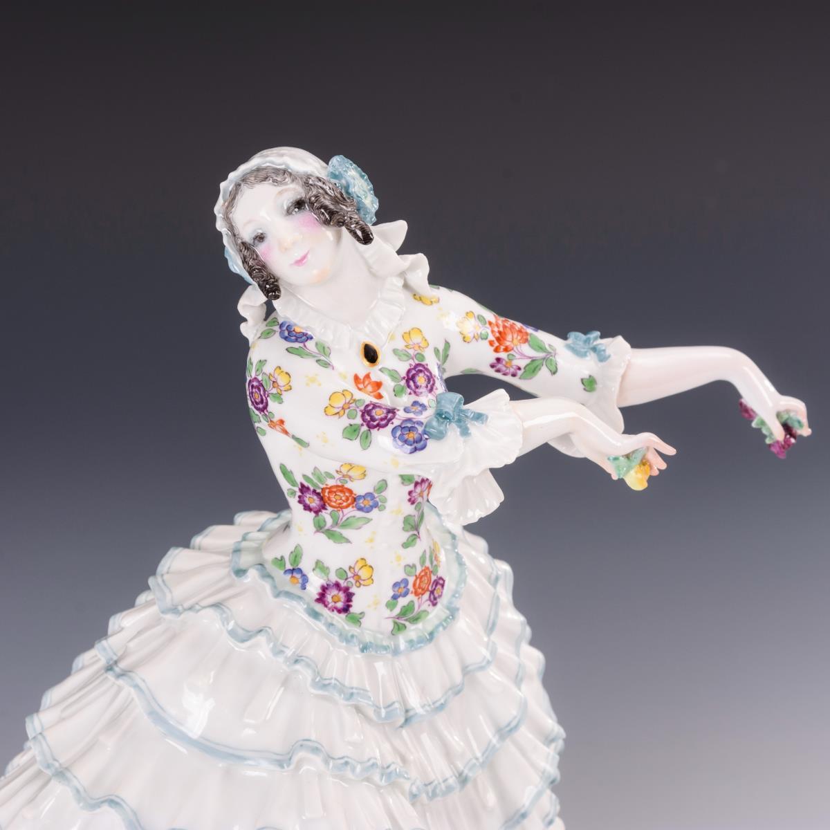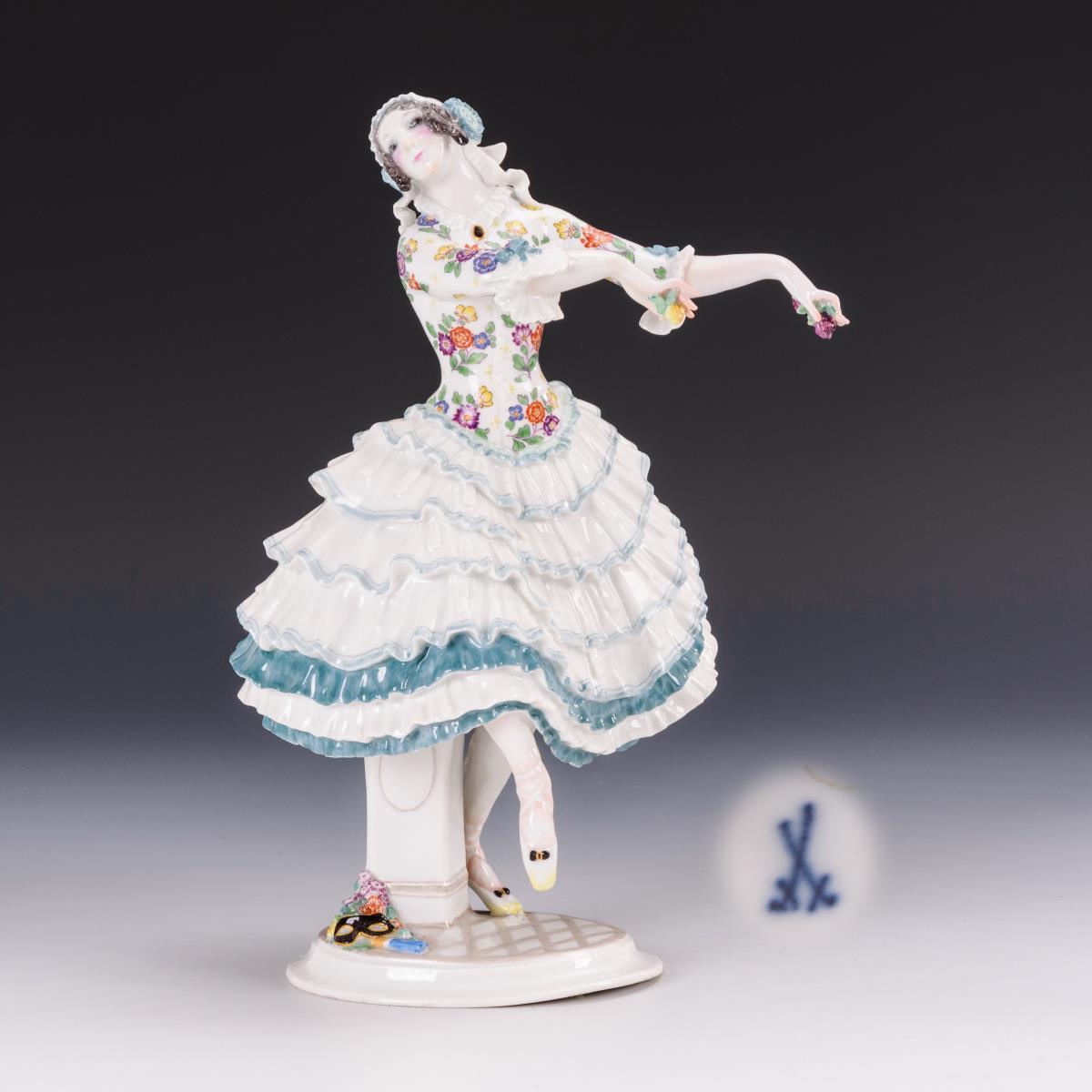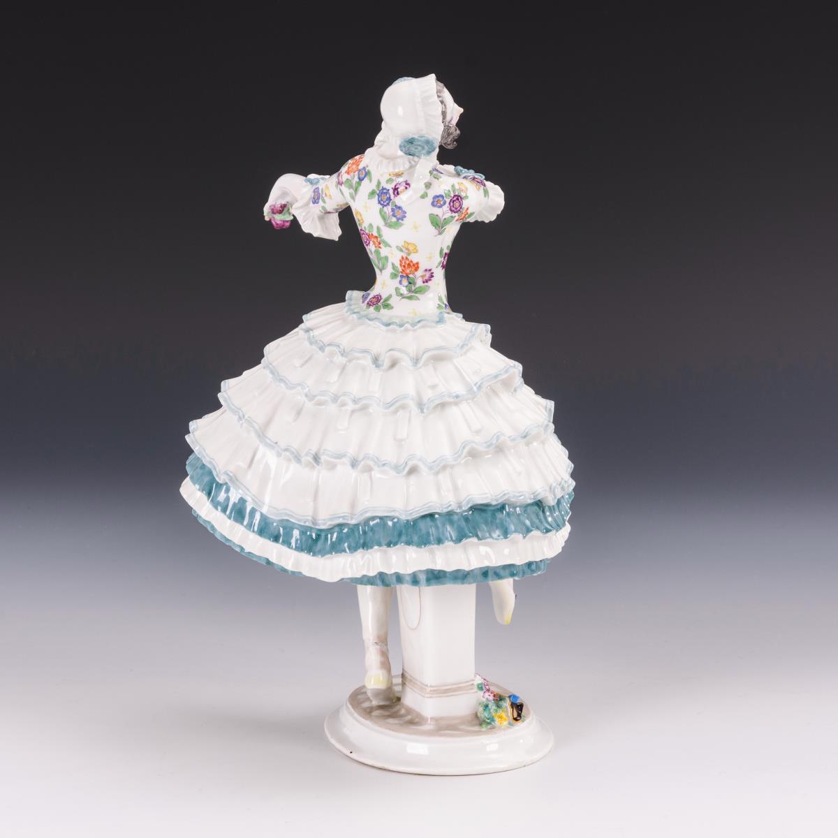 In Tanzpose stehende junge Dame im Rüschenrock, zwei Blüten in der Hand haltend. Beide Arme restauriert.
