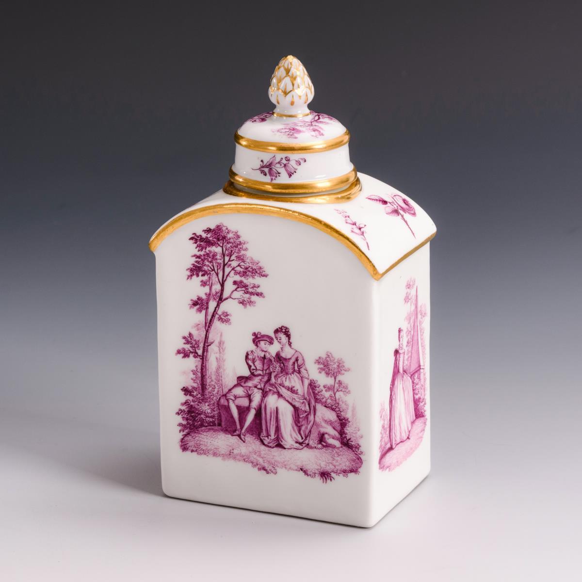 Rechteckige Dose mit allseitigen, fein gemalten galanten Szenen. Restaurierung am Mündungsrand.