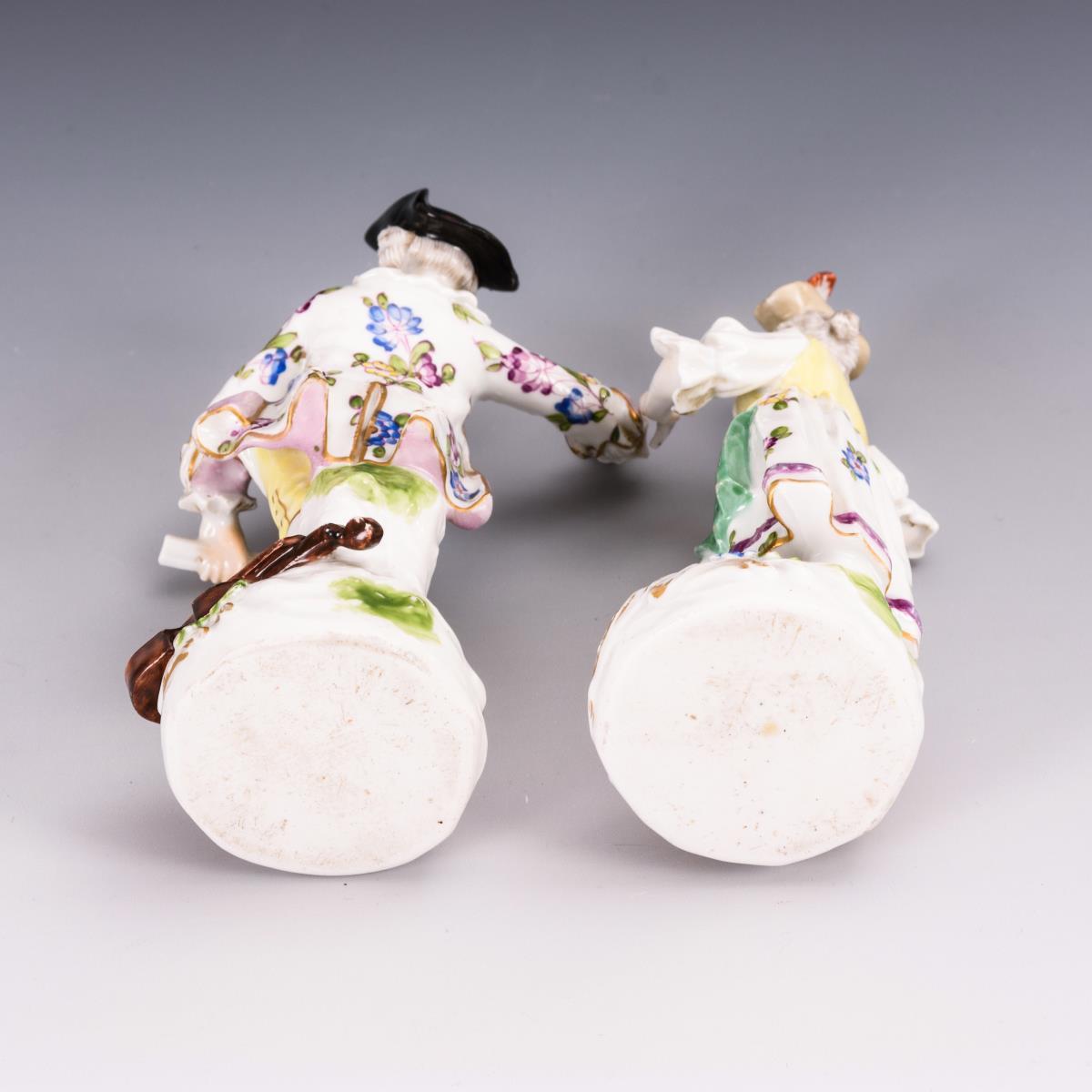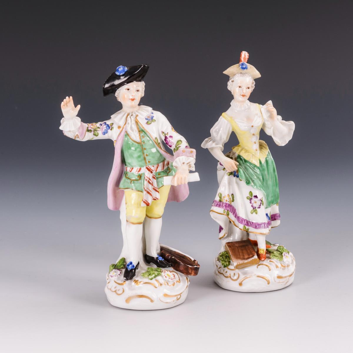 Auf einem Rocaillesockel stehender Herr mit Schriftrolle sowie einer Violine zu seinen Füßen sowie Sängerin mit Notenblatt und Notenbuch. Minimaler Goldabrieb.