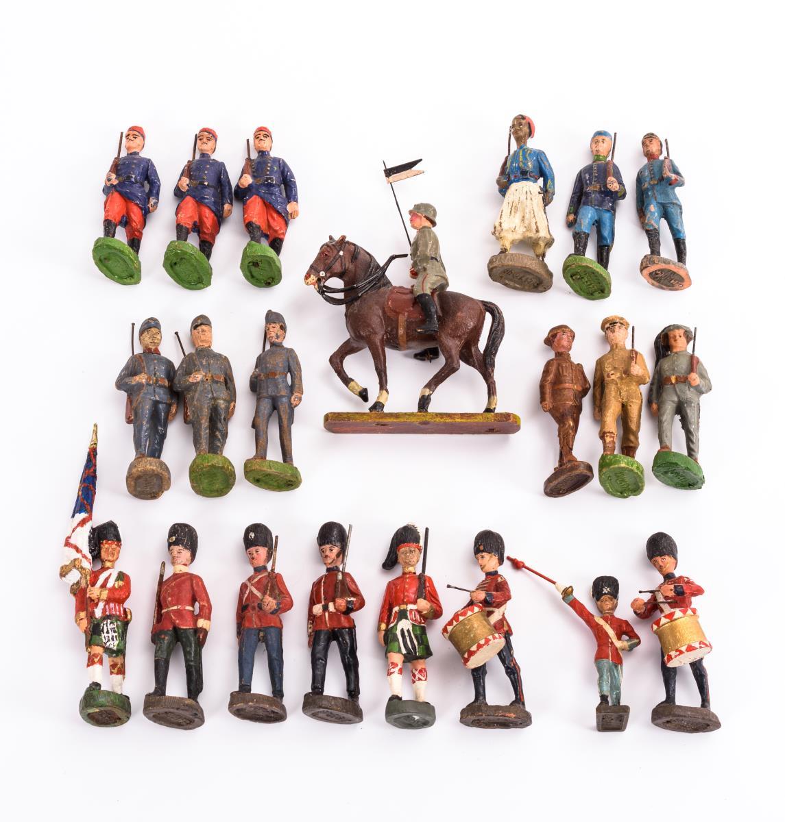 20 Figuren: 1 Reiter mit Wimpel, 1 Fahnenträger, 18 marschierende Soldaten verschiedener Nationen. Kleine Defekte, 1 Figur mit Riss in den Beinen, wacklig, teils nachbemalt.