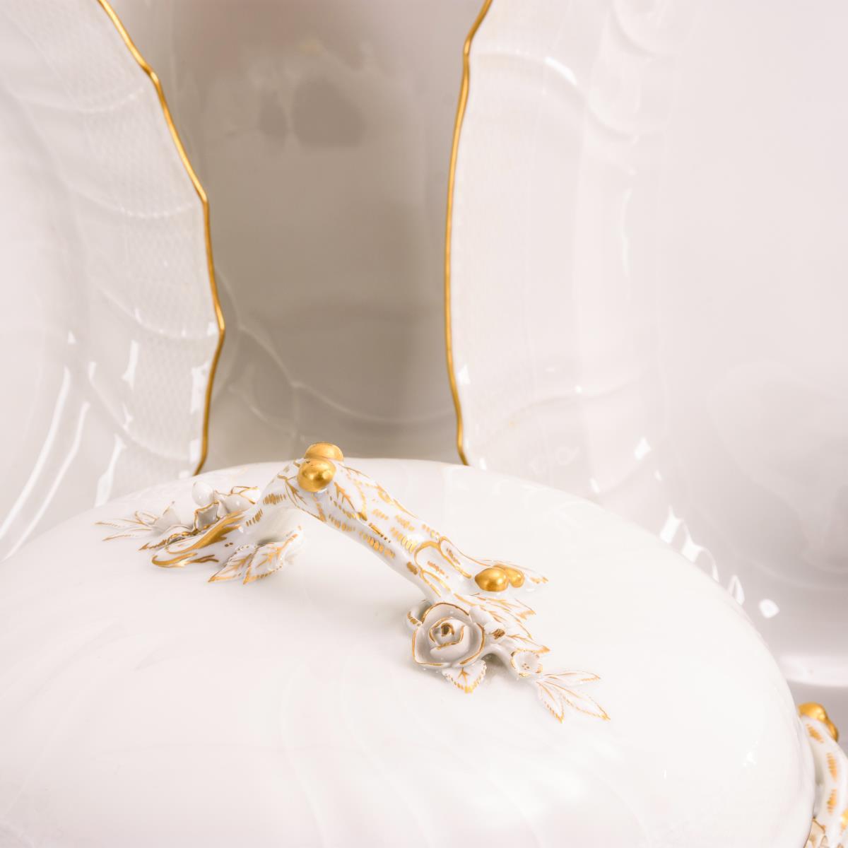 45 Teile. Form "Neuozier". 6 Speiseteller, 6 Suppenteller, 6 Vorspeisenteller (Ø 18,5 cm), 6 Beilagenteller (Ø 13,5 cm), 6 Suppentassen mit 6 Untertassen, 3 Ovalplatten (L 32, 34,5 und 40,5 cm), 1 Gemüseteller, 2 runde Schalen (Ø 22,5 und 24,5 cm), 1 Sauciere, 1 Deckelschüssel und 1 runde Terrine. 1 Rosenblüte an 1 Terrinenhandhabe minimal bestoßen, 1 Rundschale mit kleiner Randbestoßung und Standringbestoßung, 1 Suppentasse mit Haarrrissspinne.