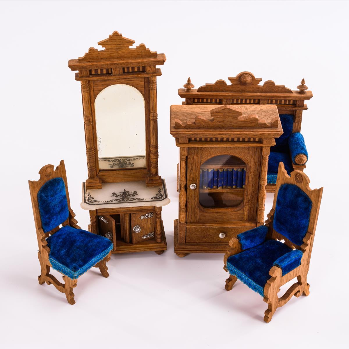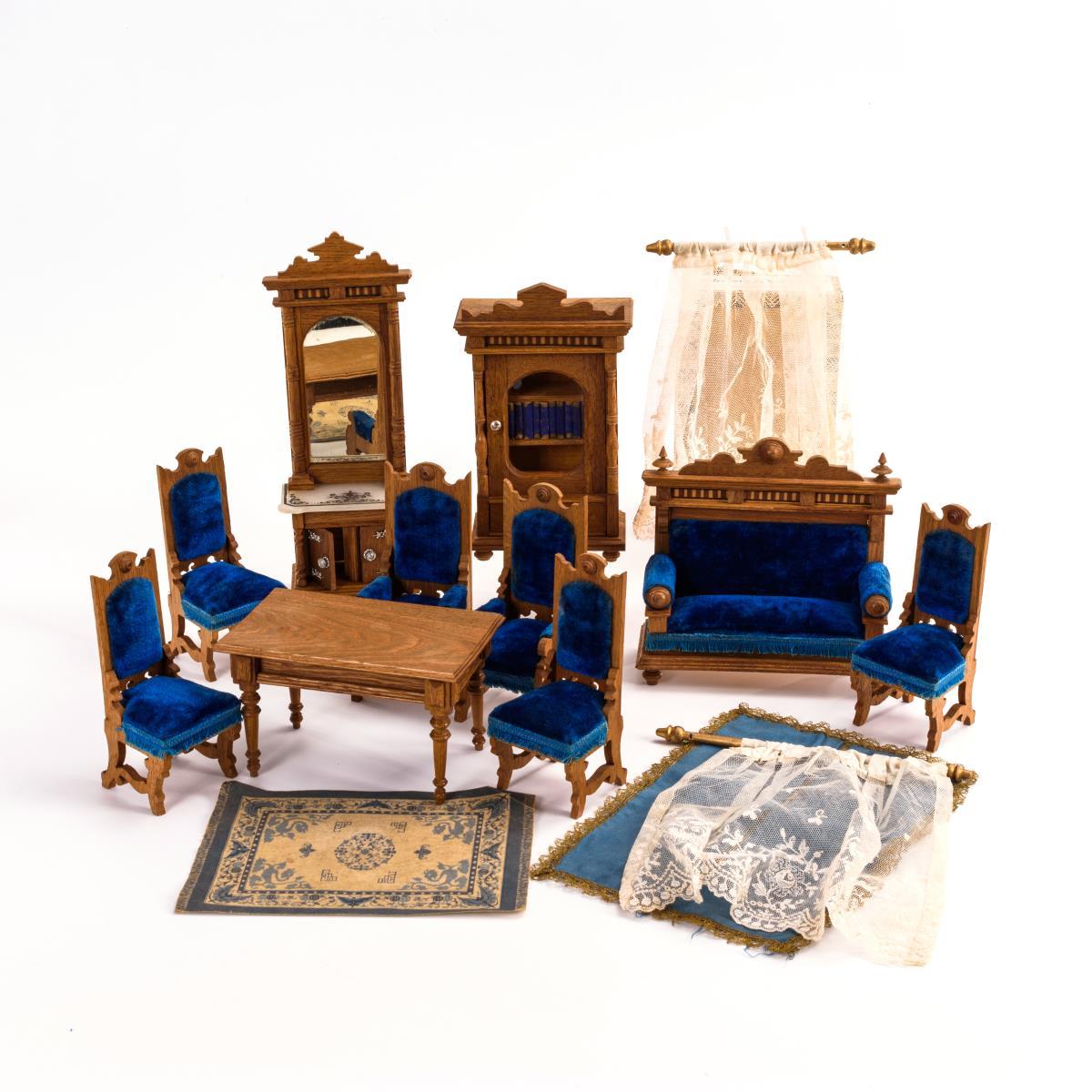 10 Möbel im Stil der Gründerzeit: Bücherschrank, Konsolspiegel, blau bezogenes Sofa, Tisch, 2 Sessel und 4 Stühle. Dazu 2 Gardinen mit Stange, Teppich und Decke. Kaum bespielt.