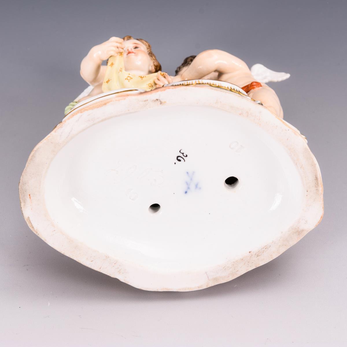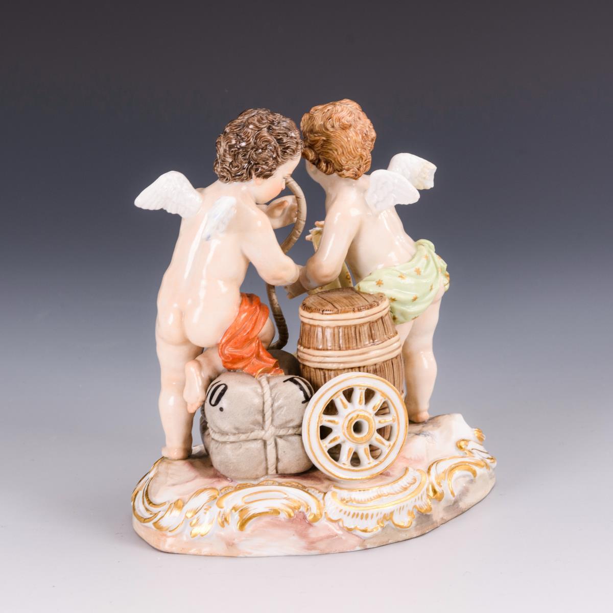 Zwei auf einem Rocaillesockel stehende Putten mit Fass, Warenpaket und Tuchballen. 1 Puttenflügel bestoßen.