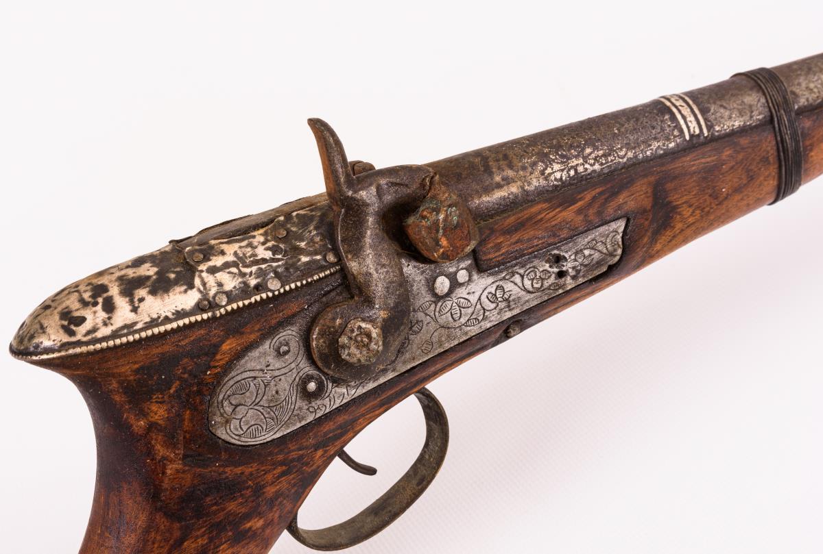 Schlossplatte schön graviert, die anderen Metallbeschläge eher einfach geschnitten. Ladestock fest. Hahn defekt. Starke Alters- und Gebrauchsspuren, einige Defekte.