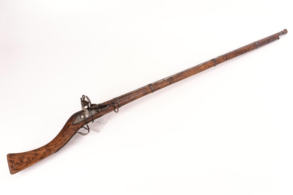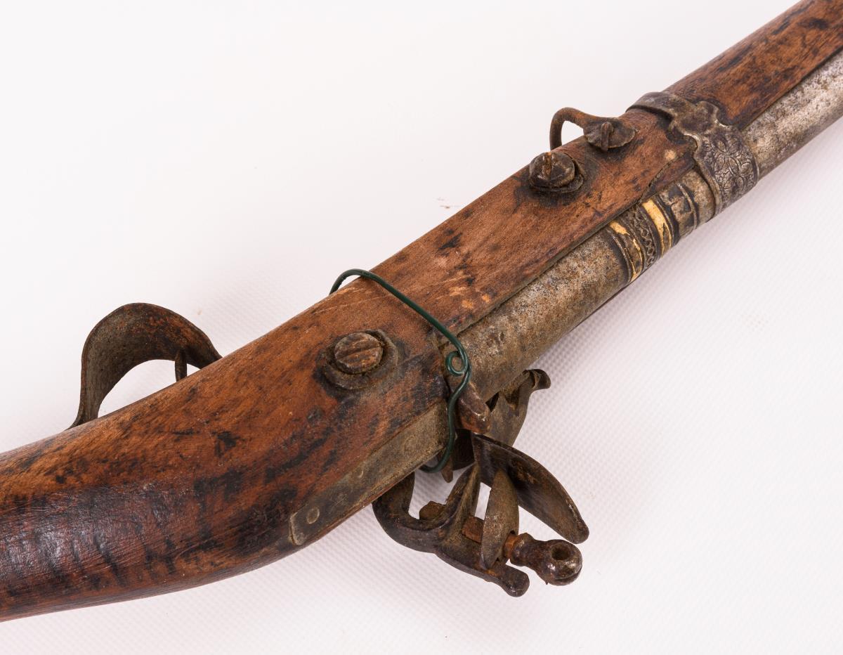 Kräftiges Schloss mit verschiedenen Punzen: steigender Löwe, nach links blickend / 1809 / und bekrönte '3'. Glatter Lauf mit verdicktem Ende und verzierten Spangen. Holzschaft mit Farbresten, wohl jünger überlackiert.