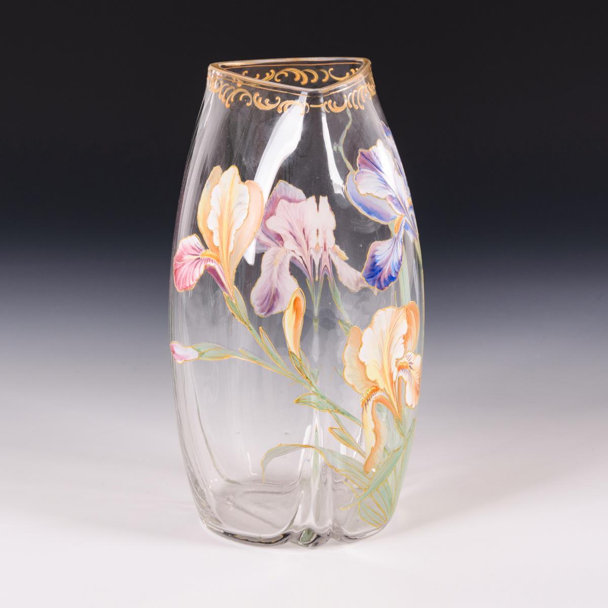 Ovoid-dreiseitige Vase mit dreieckigem Mündungsrand. Umlaufend gemalte Irisstängel. Partieller Goldabrieb.
