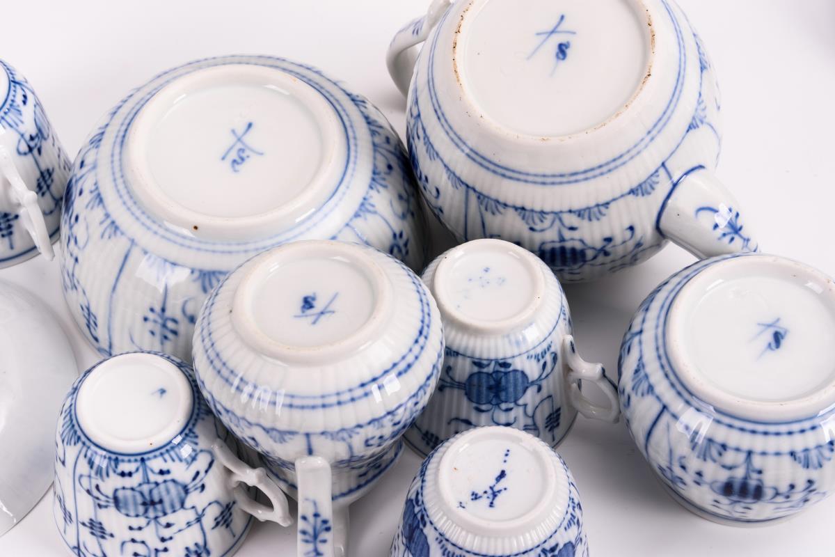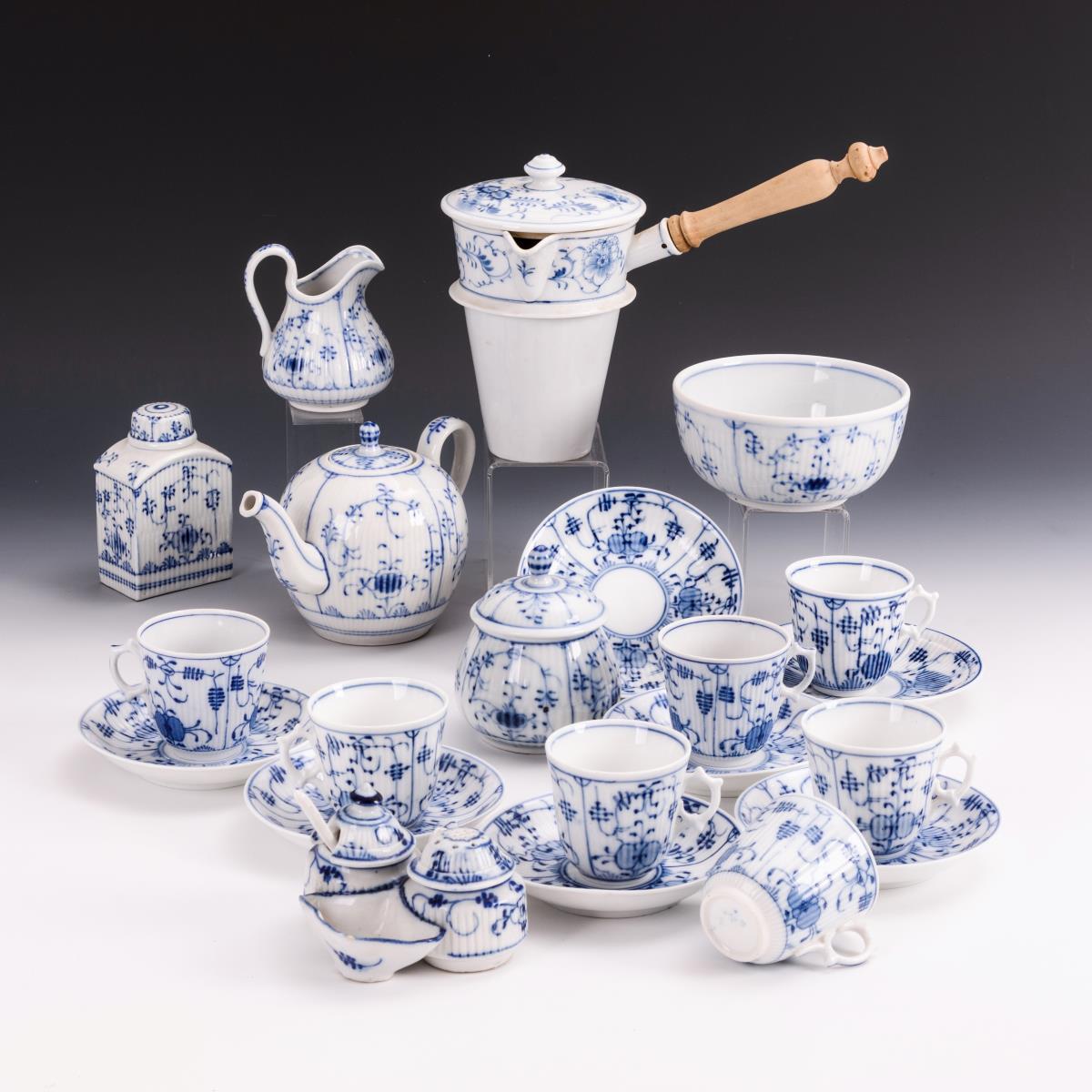 Teekännchen (H 12,5 cm), Zuckerdose, Milchkännchen, Teedose, Spülkumme, 7 Tassen, 7 Untertassen, 1 Gewürzmenage mit Porzellanlöffelchen sowie 1 Zwiebelmuster-Einsatzkännchen mit seitlichem Griff (innen bezeichnet "W. Reinders & Co. Arnhem". Chip an 1 Tassenrand.