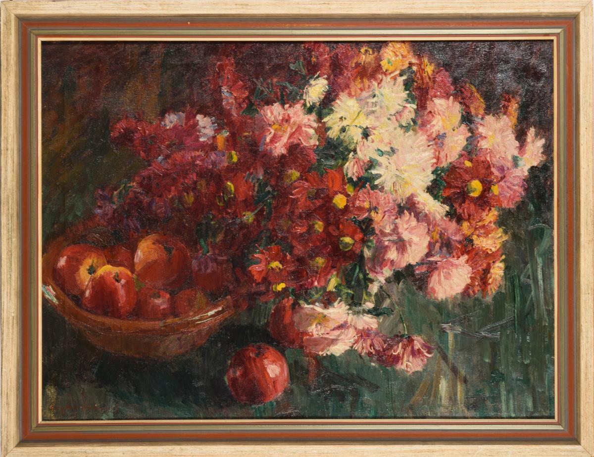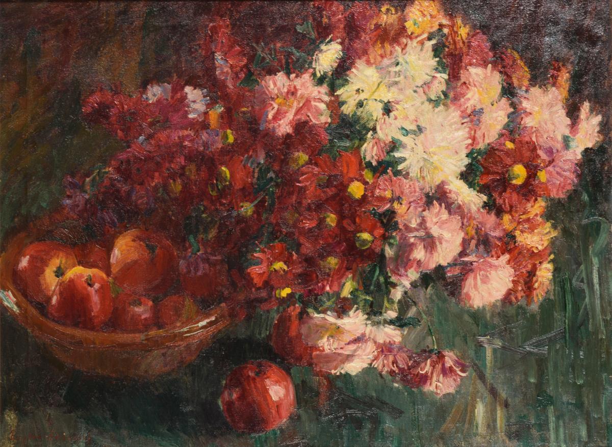 Dichter Blumenstrauß aus verschieden farbigen Blumen neben einer Schale voller Äpfel.
