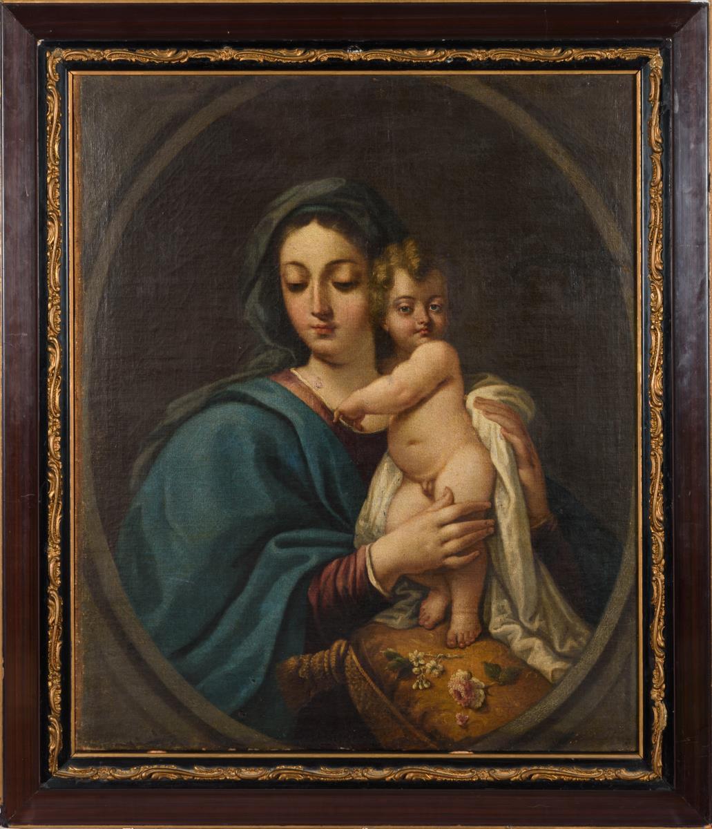 Andächtig zu Boden blickende Maria mit dem Jesusknaben auf einem Kissen. Leinwand doubliert, Defekte.