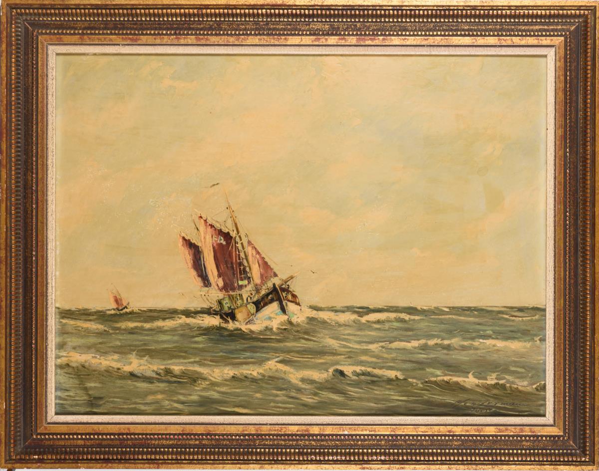 Fischerboot im Sonnenschein auf offener See. Leichte Altersspuren.