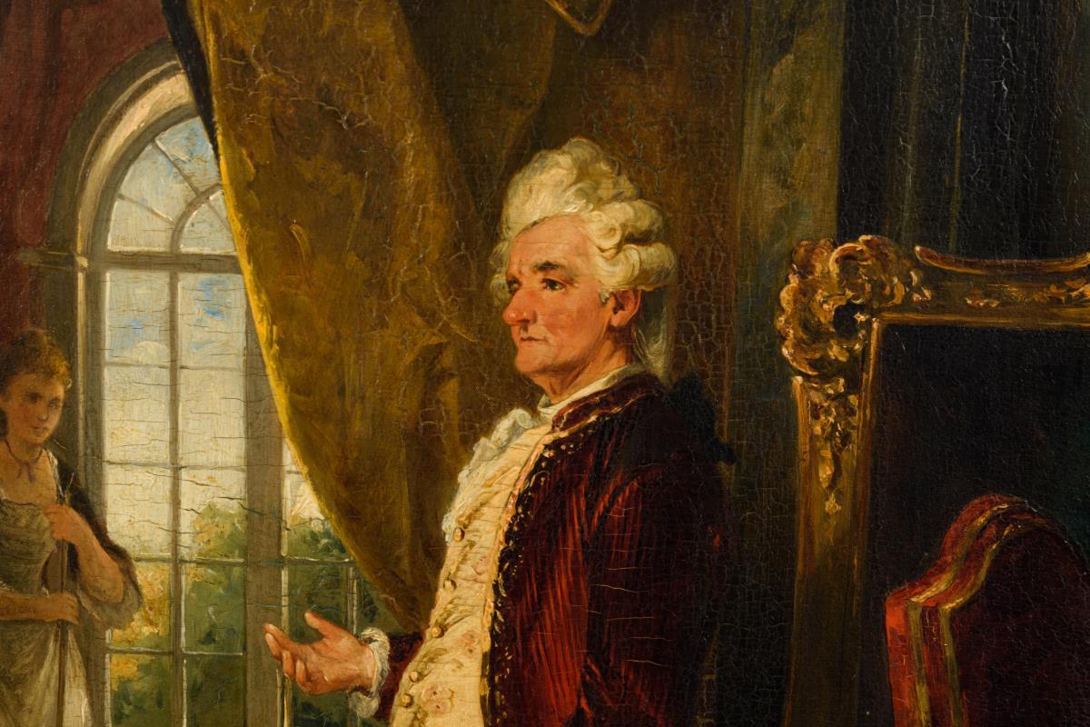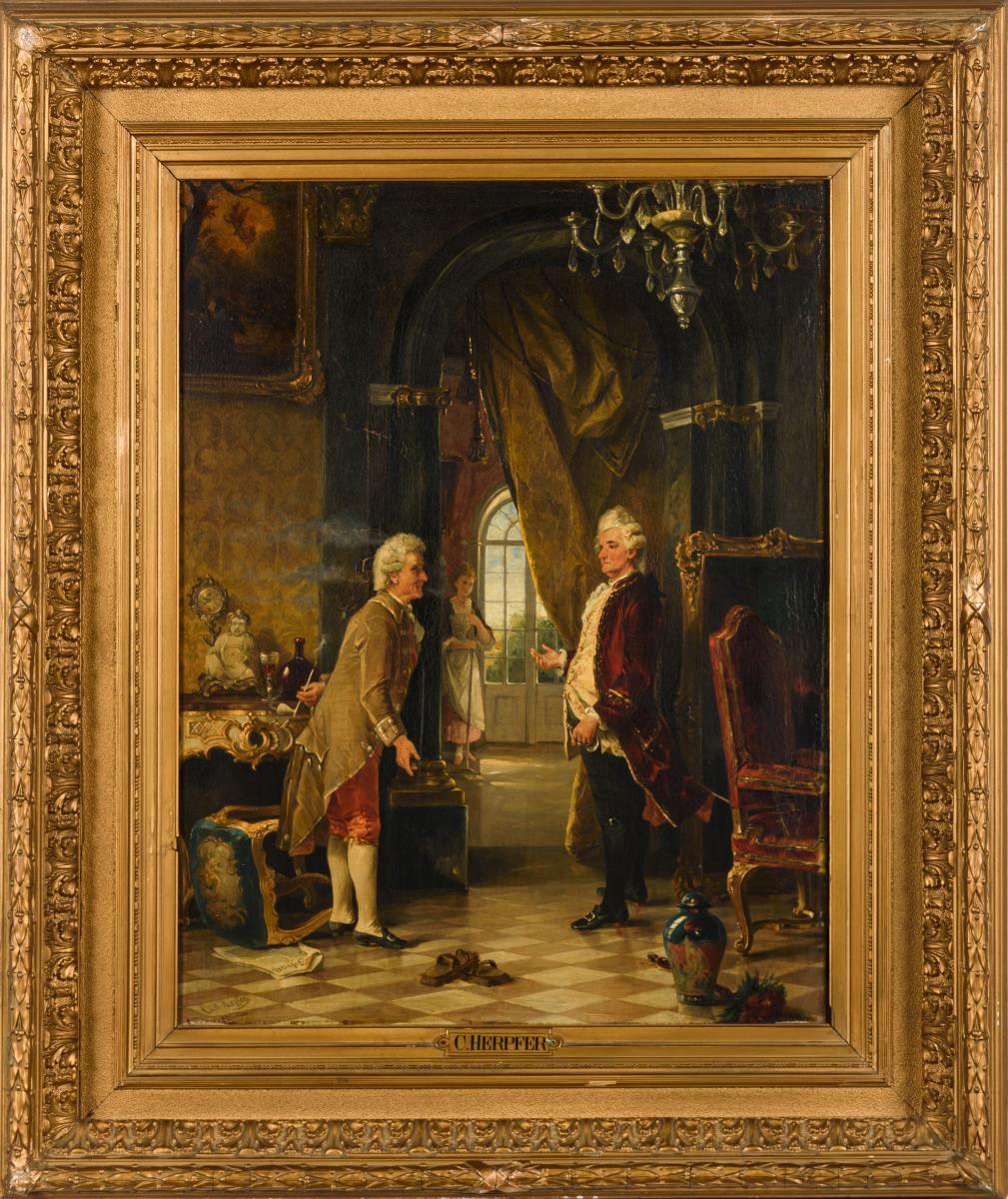 Zwei Herren in der Kleidung des 18. Jahrhunderts im Gespräch in herrschaftlichen Räumlichkeiten. Altersspuren.