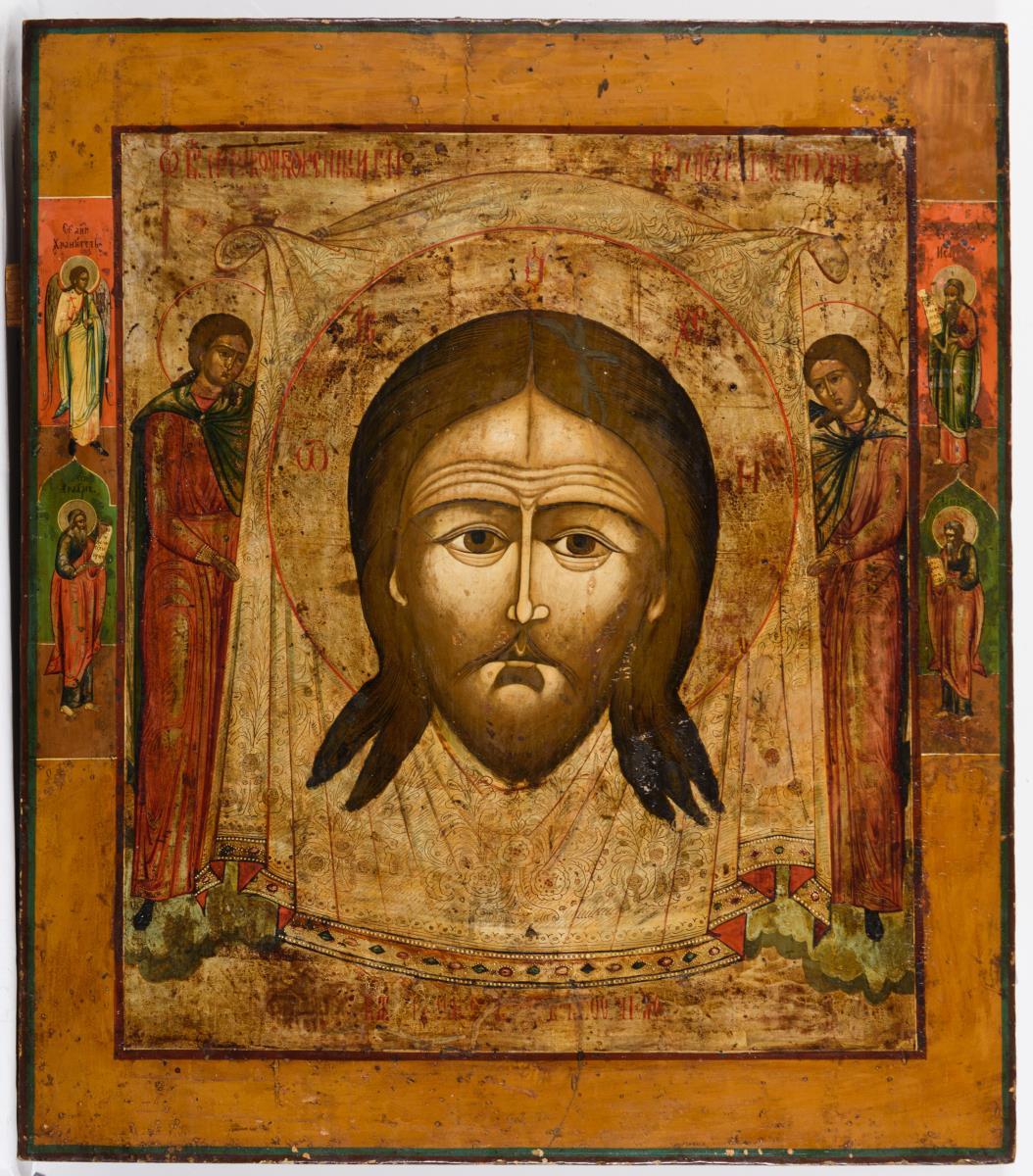 Das Mandylion mit dem Konterfei Jesu flankiert von Engeln. Altersspuren.