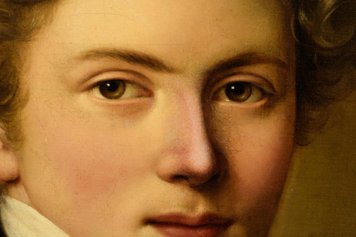 Junger Mann mit gelocktem Haar und in dunklem Rock vor neutralem Hintergrund. Leinwand wachsdoubliert.