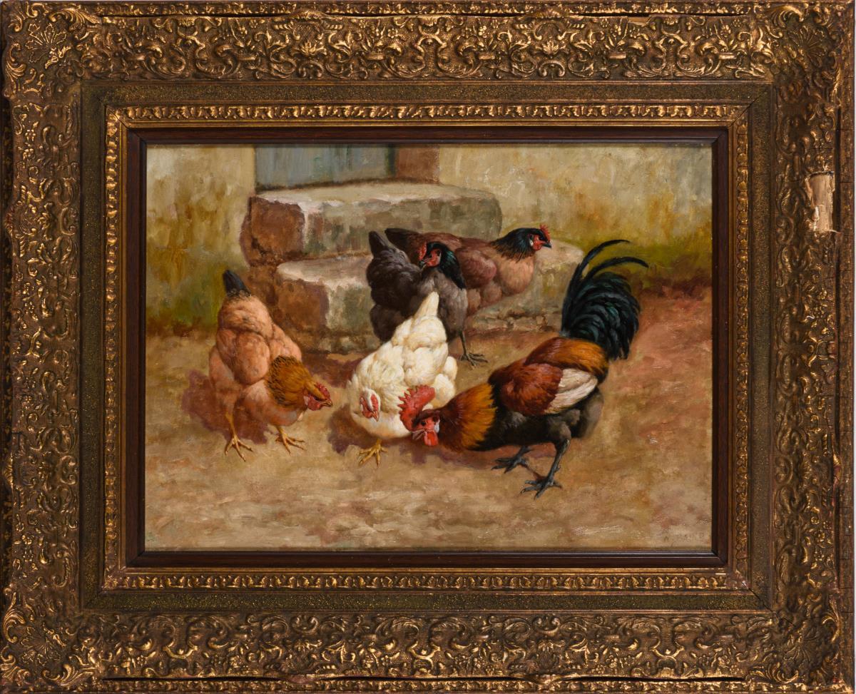 Das Geflügel im Sonnenschein vor der Treppe.