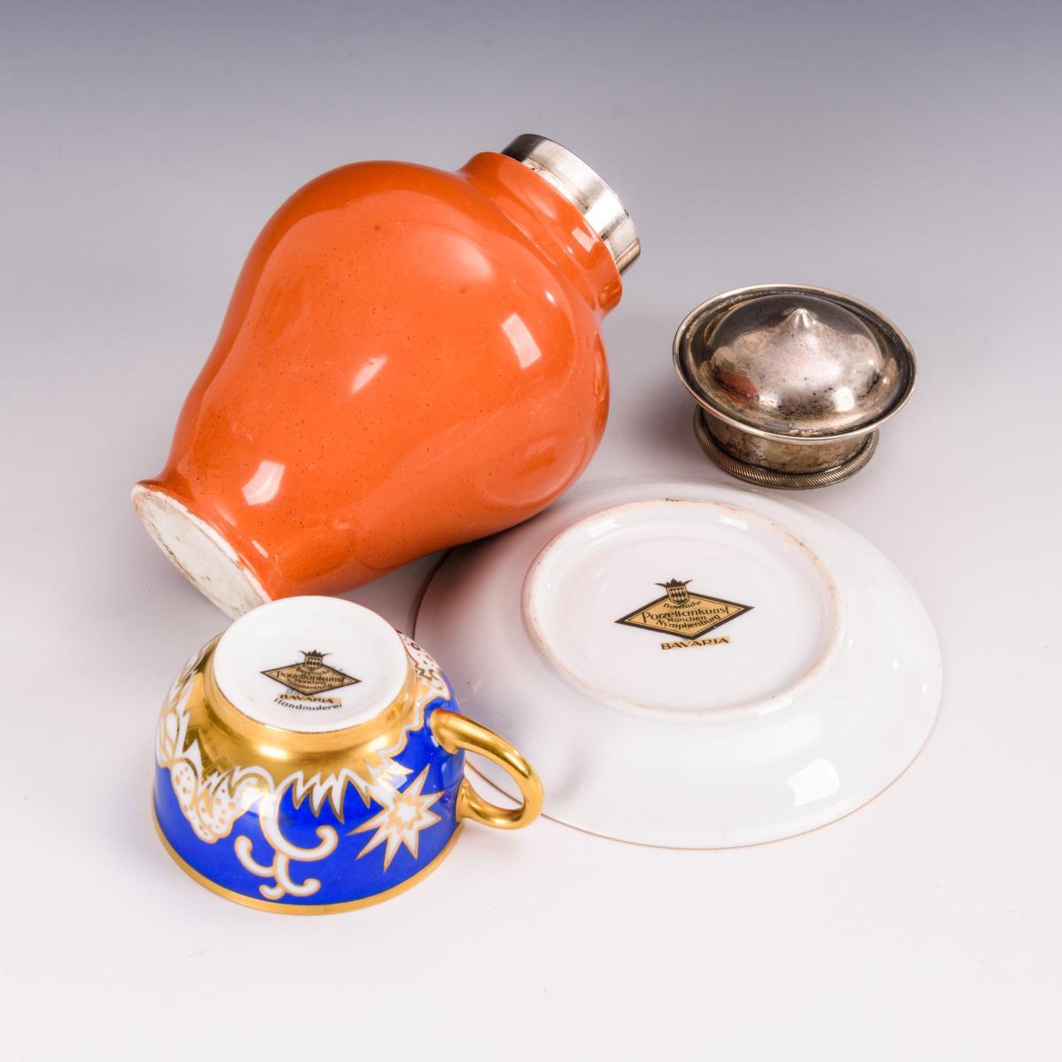 Baluster-Teedose mit orangefarbenem Fond, silbermontierter Mündung und Silberdeckel sowie einem schauseitigen Antikenkopf (H 14,5 cm). / Art-déco-Mokkatasse mit blauem Fond und ornamental-vegetabilem Goldmuster (H Tasse 4 cm, Ø Untertasse 11,5 cm).