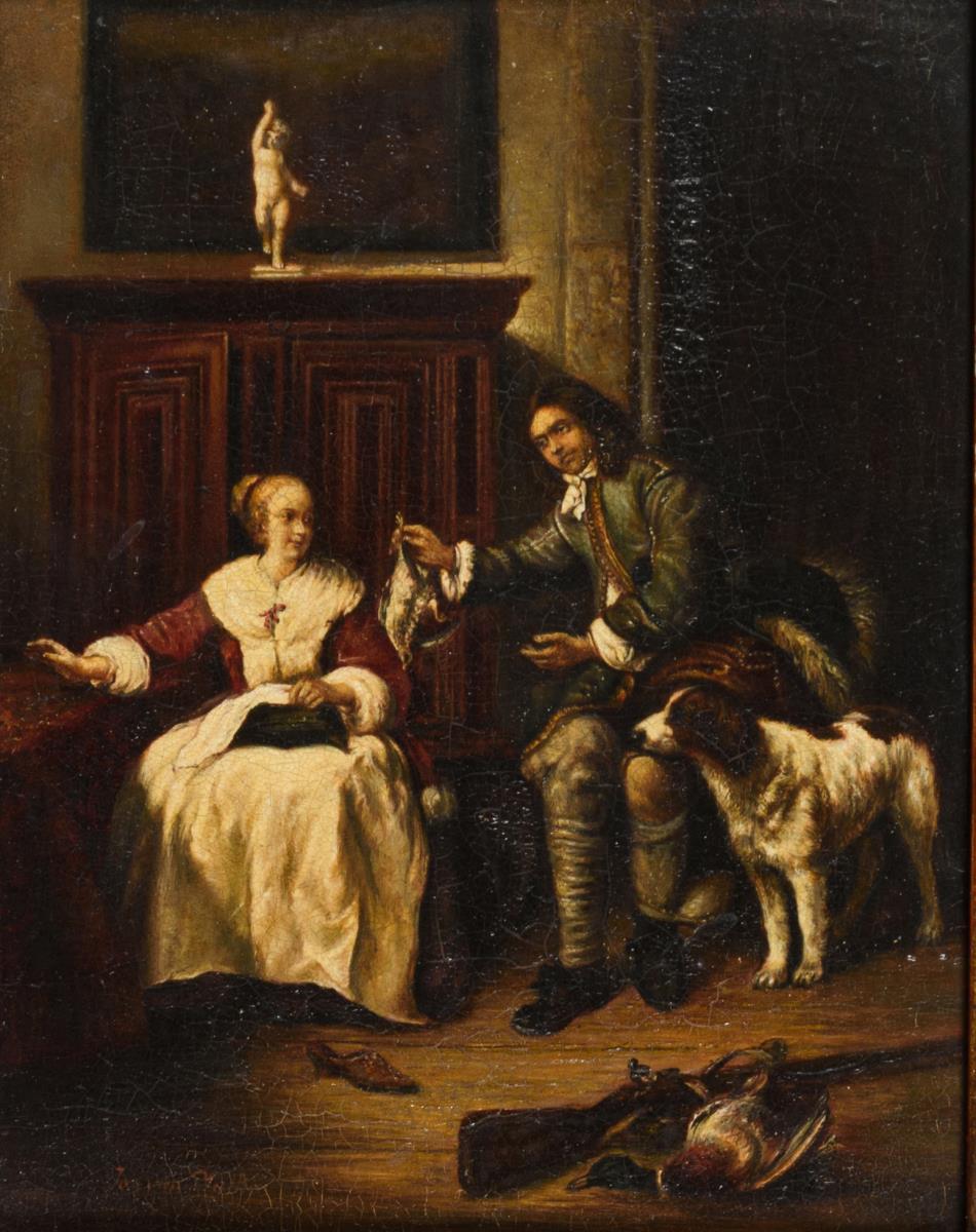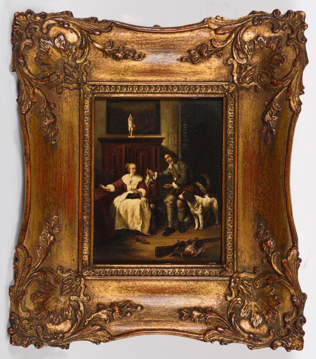 Detailliert gemalte Genreszene mit jungem Paar und Jagdhund in der Stube. Minimale Altersspuren.