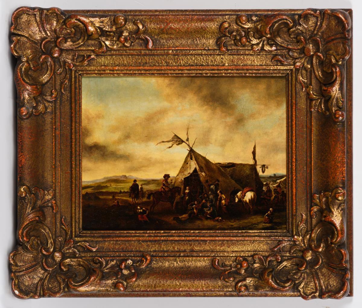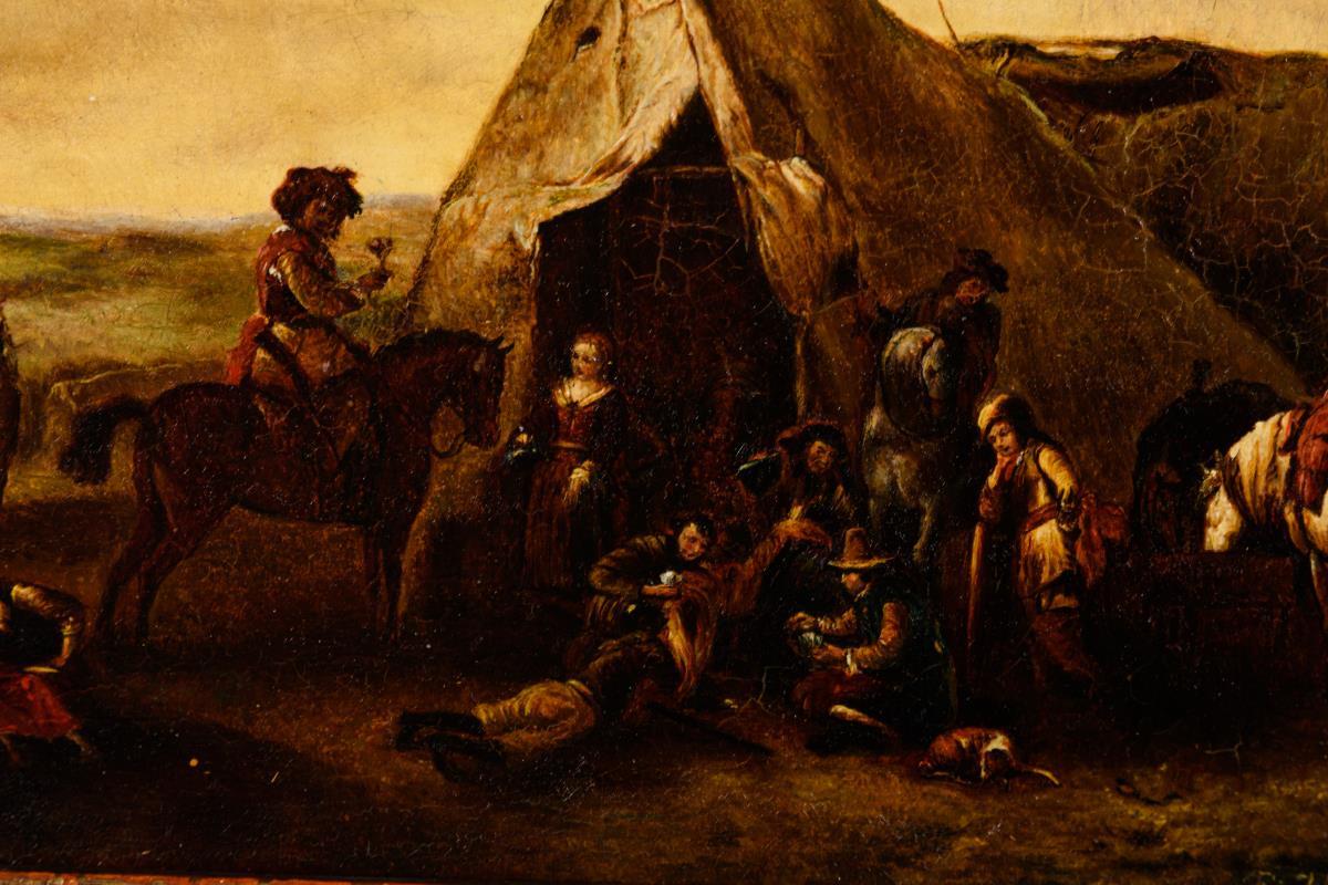 In der Art von Wouwerman gemalte Genreszene mit Reitern an einem Zelt in weiter Landschaft. Altersspuren.