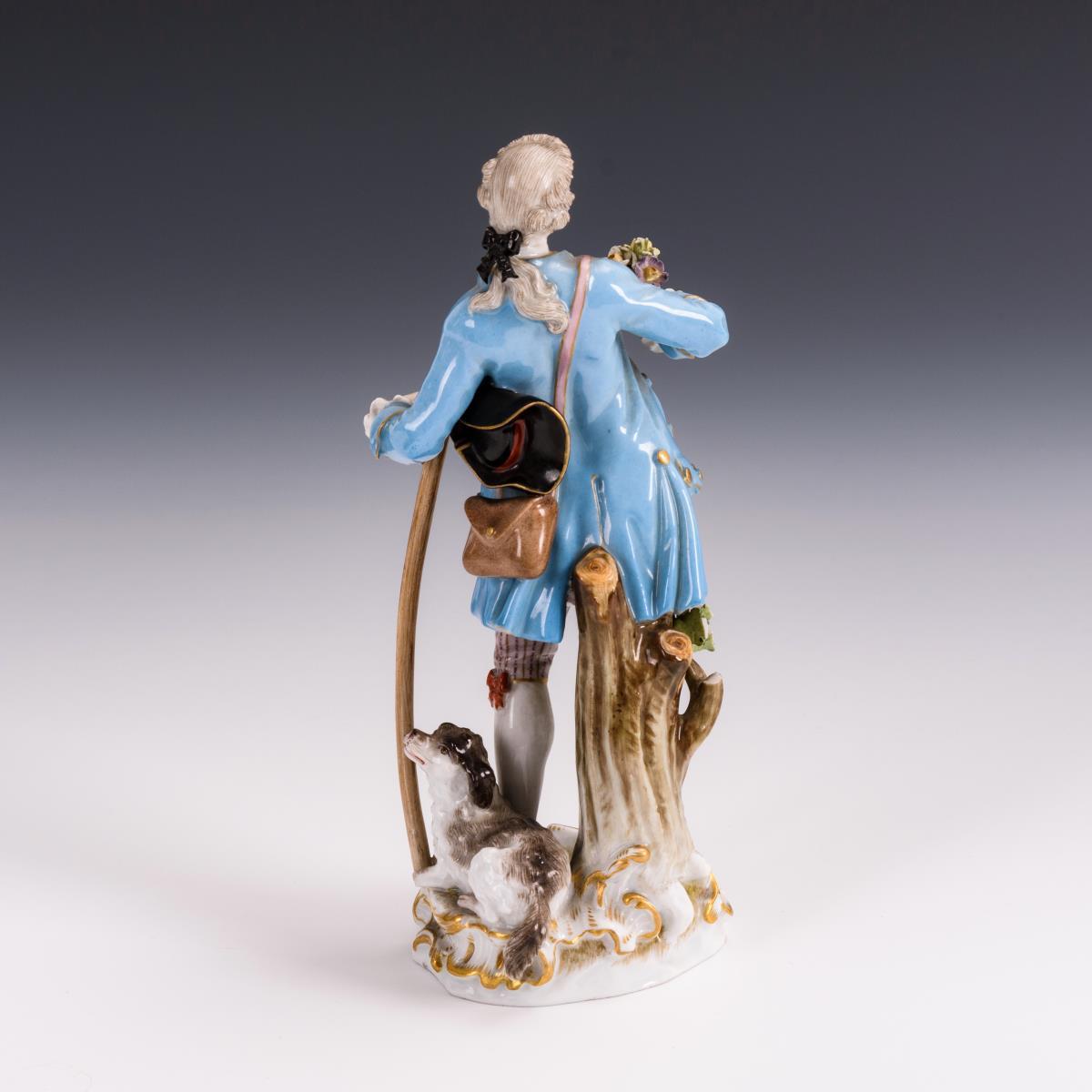 Auf einem Rocaillesockel stehender Kavalier mit Stab und Rosenstrauß. 1 Finger, 1 Zweig sowie Blüten und Blätter bestoßen.