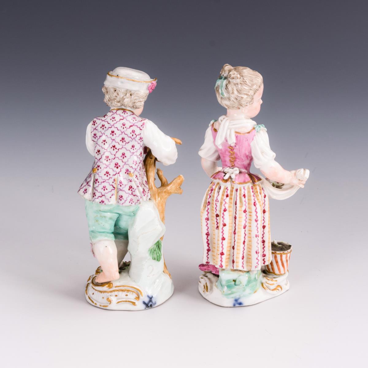 Gärtnermädchen mit blütengefüllter Schürze und Blumentopf und Gärtnerknabe als Winzer. Blumentopfblume fehlt, Blüten, partiell Schleifenband, Hut des Knaben und Äste bestoßen, partieller Goldabrieb.