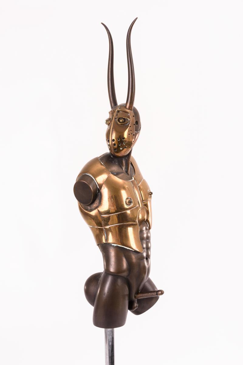 Im Labyrinth stehender Torso eines gerüsteten Mannes mit Stiermaske sowie verschieden ansteckbarem Penis.