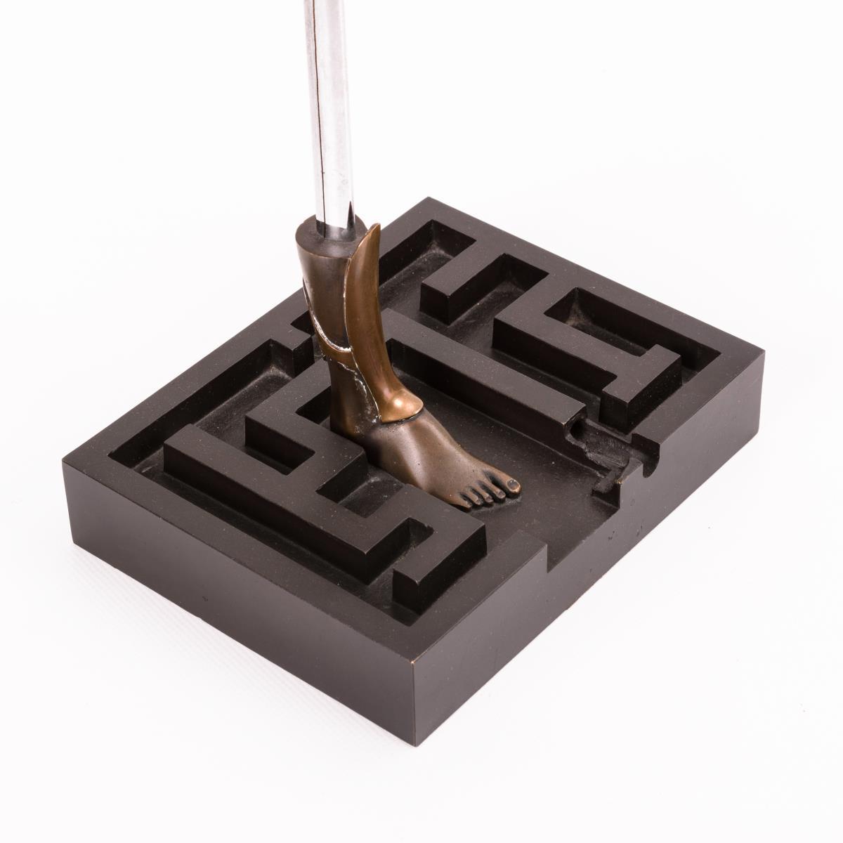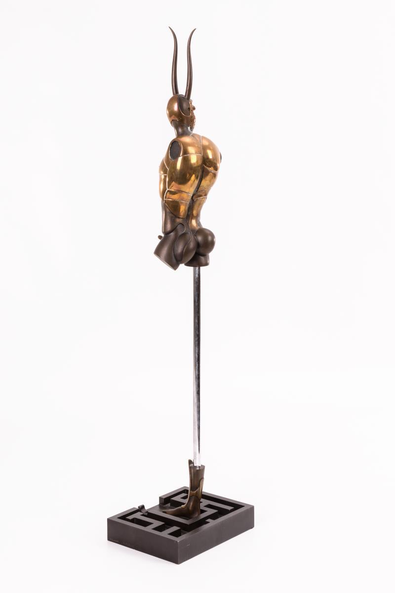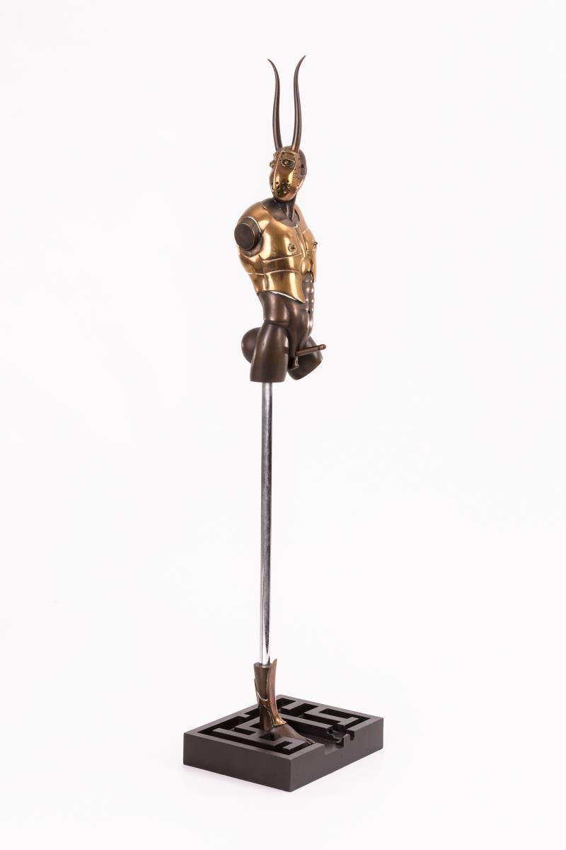 Bronze braun bzw. schwarz patiniert, teils poliert, Eisen verchromt. Bezeichnet mit Zählung "148/2000", Gießermarke "Venturi Arte". H gesamt 77,5 cm.