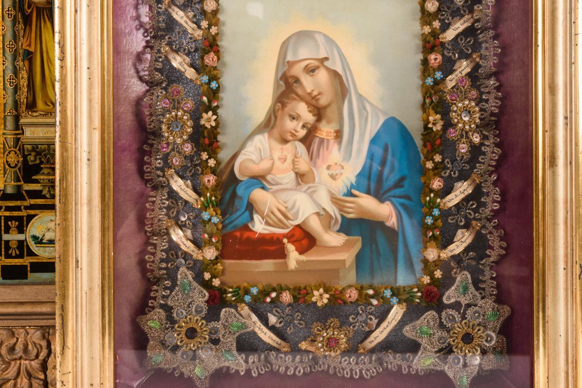 Die Heilige Familie hinter der Verglasung mit neogotischem Zierwerk im Rahmen mit "Spieluhr" (läuft, mehrere Weihnachtslieder). / Verglaste Berliner Leiste; darin Drahtarbeit mit Steinen einer Jerusalem-Wallfahrt und Lithografie (Madonna und Jesus mit brennenden Herzen). Goldstuckrahmen mit Fehlstellen überbronziert, Spielwerk schwergängig bzw. Schramme am Madonnenbild, je Alters-/Gebrauchsspuren.