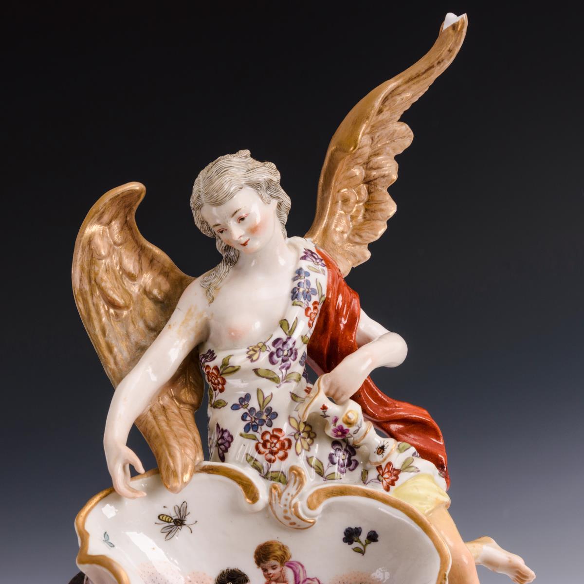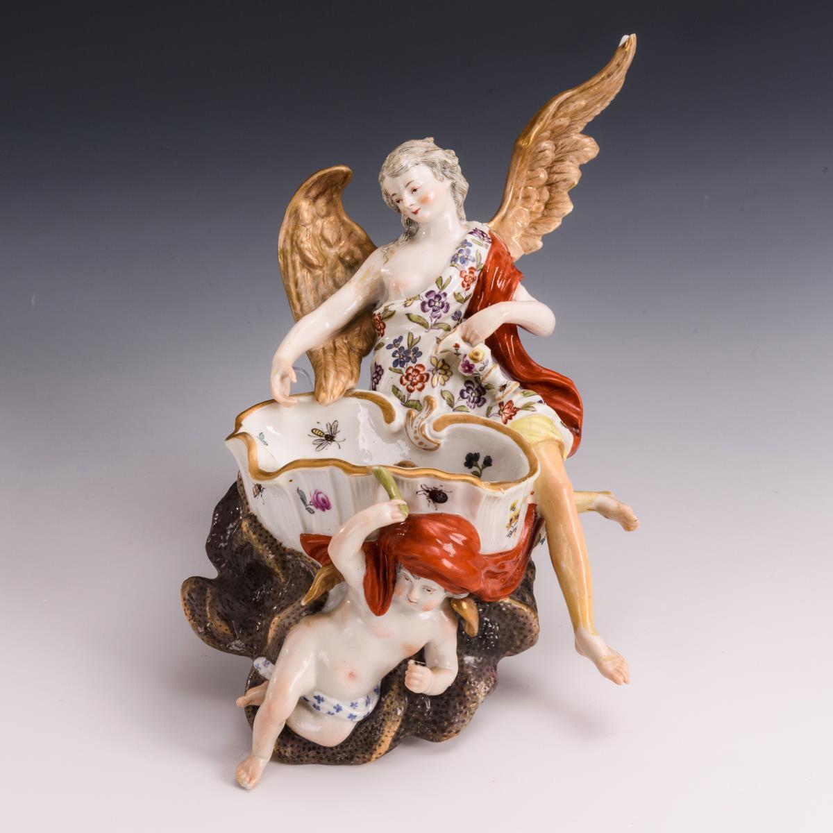 Auf einer dunklen Nachtwolke und einem Engel ruhende Muschelschale, daran ein großer Engel mit Wasserkanne sitzend. 1 Flügel und 1 Bein des großen Engels restauriert, 1 Flügelspitze des großen Engels sowie Blatt in der Hand des kleinen Engels bestoßen, Kreuz in der Hand des kleinen Engels fehlt.