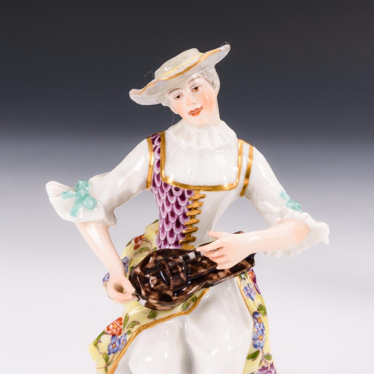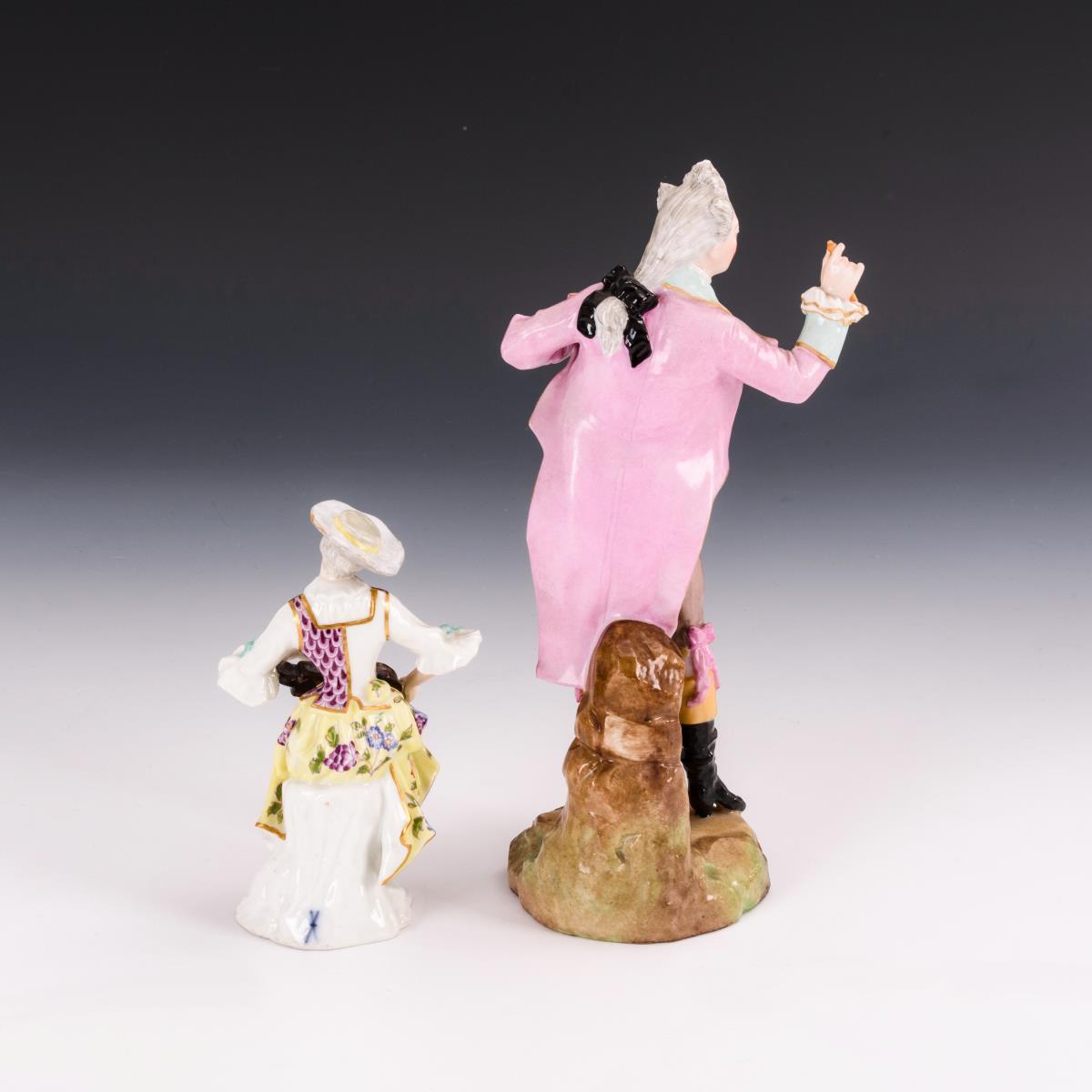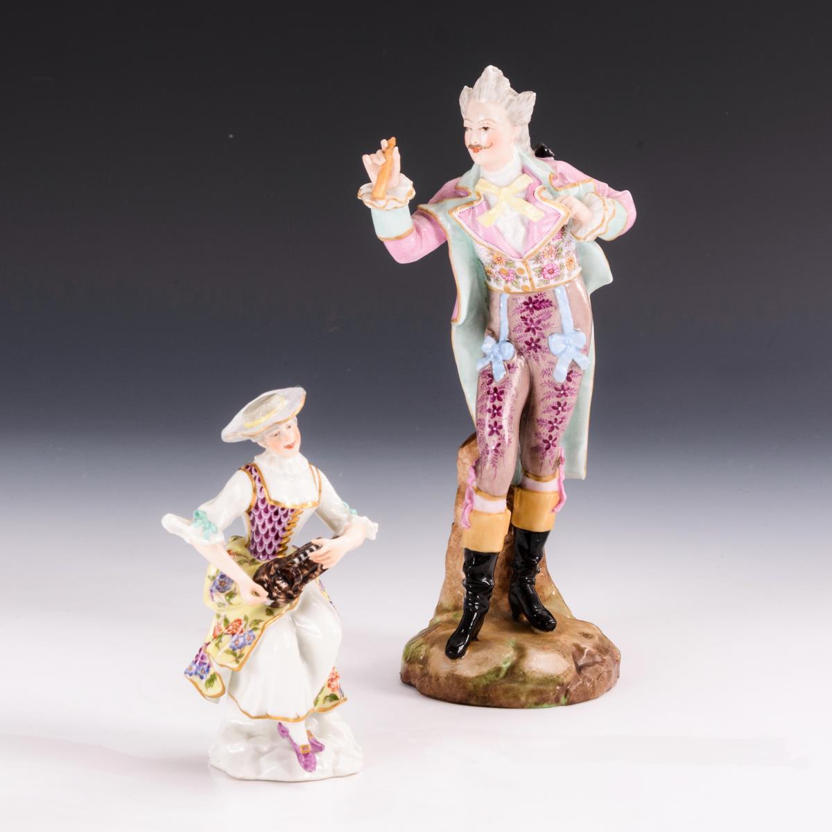 Auf einem Baumstumpf sitzende, eine Drehleier spielende Dame (H 12 cm). / Stehender, eine Schachfigur zeigender Rokokoherr. Hut der Dame restauriert.