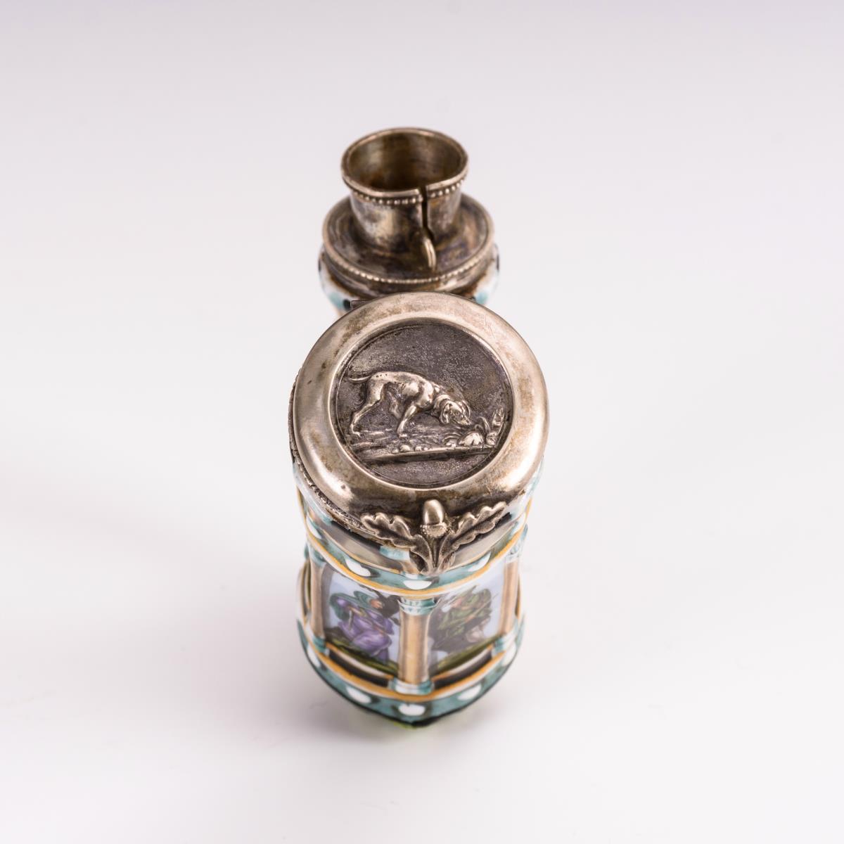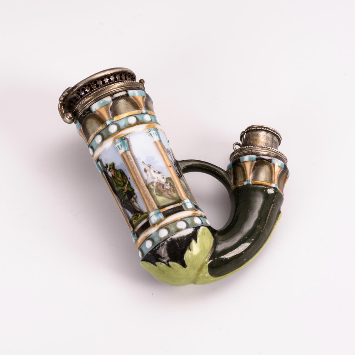 Pfeifenkopf mit Säulengliederung, in den Kompartimenten Jagddarstellungen sowie die Darstellung einer jungen Frau und eines Jägers, silbermontiertes Verbindungsstück und Scharnierdeckel. Gold berieben.