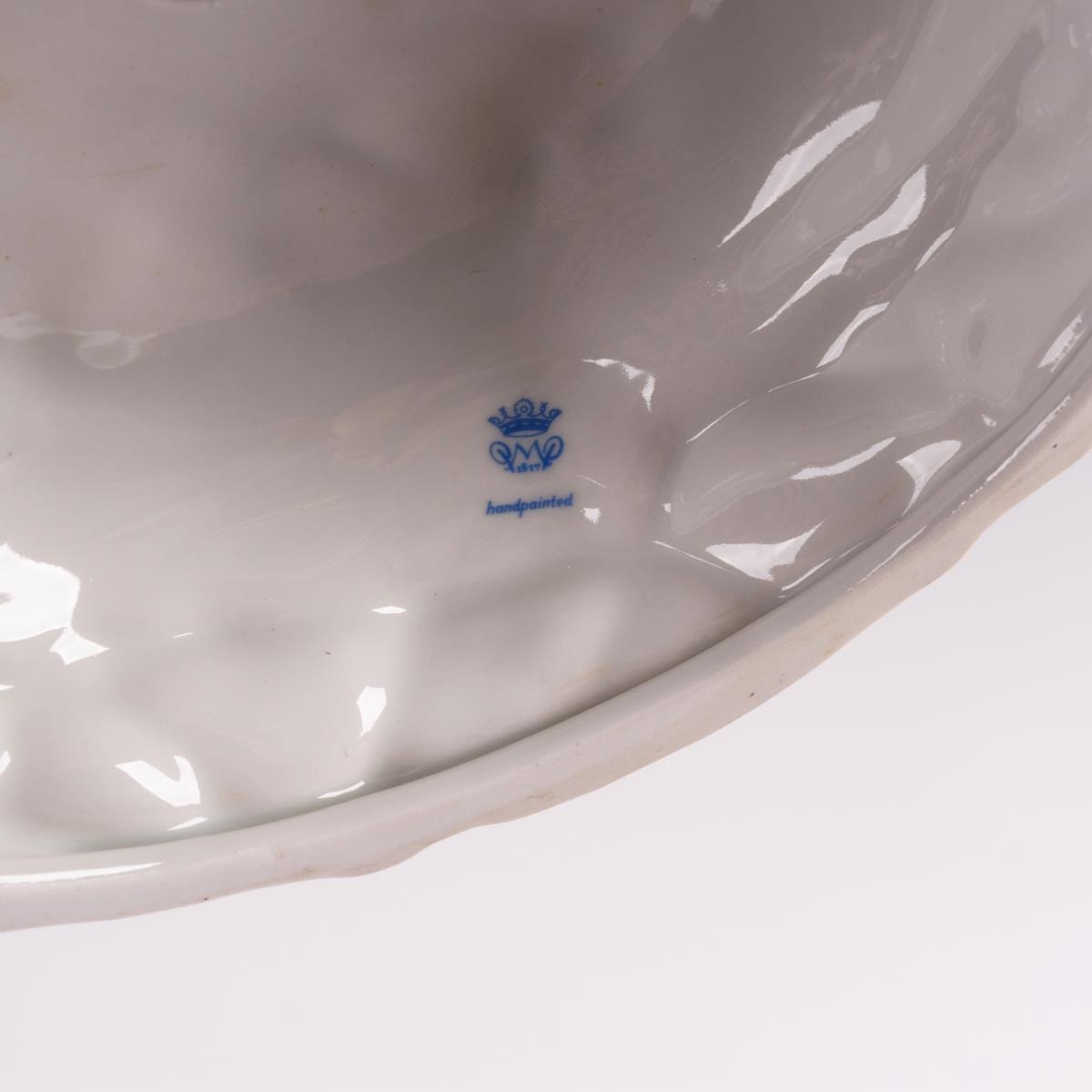 Durchbrochene, blütenbelegte Schale mit einem als Apfelbaumstamm gestalteten Schaft, daran ein Knabe auf der Leiter sowie ein Mädchen mit Äpfeln. Minimale Bestoßungen am Belag.