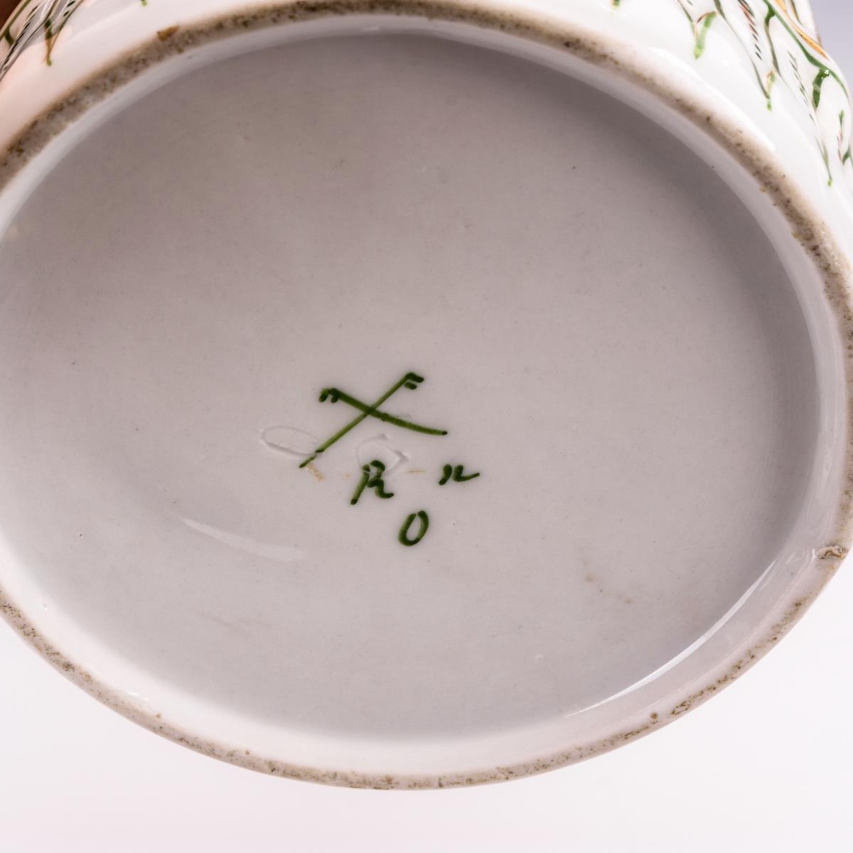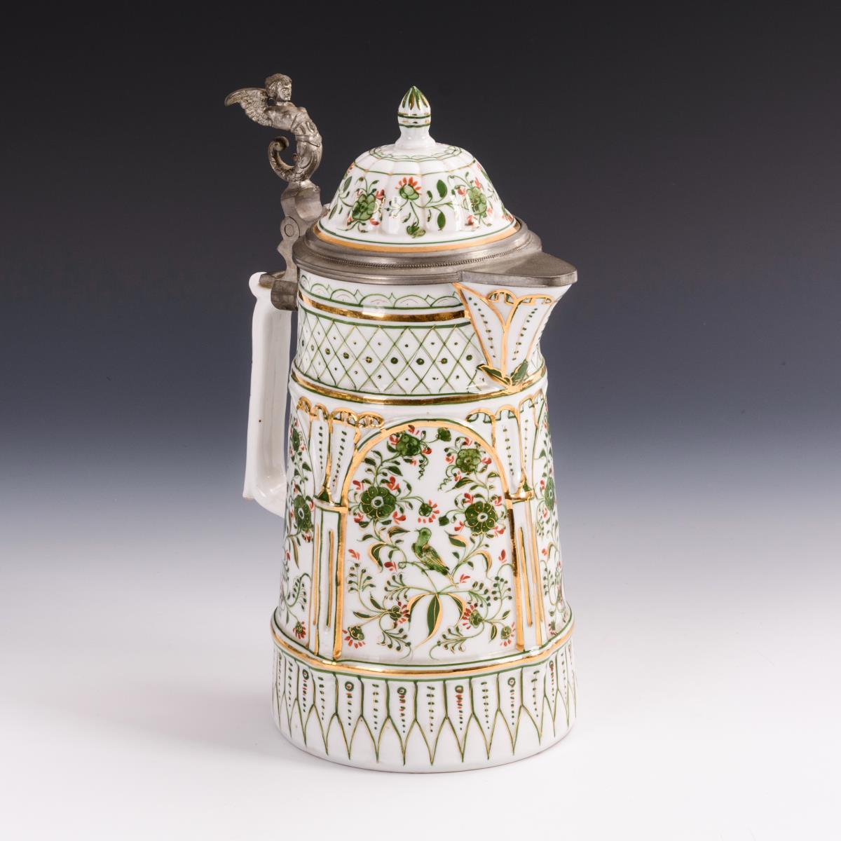 Unterglasurgrüne, rot- und goldgehöhte Malerei. H 29 cm.