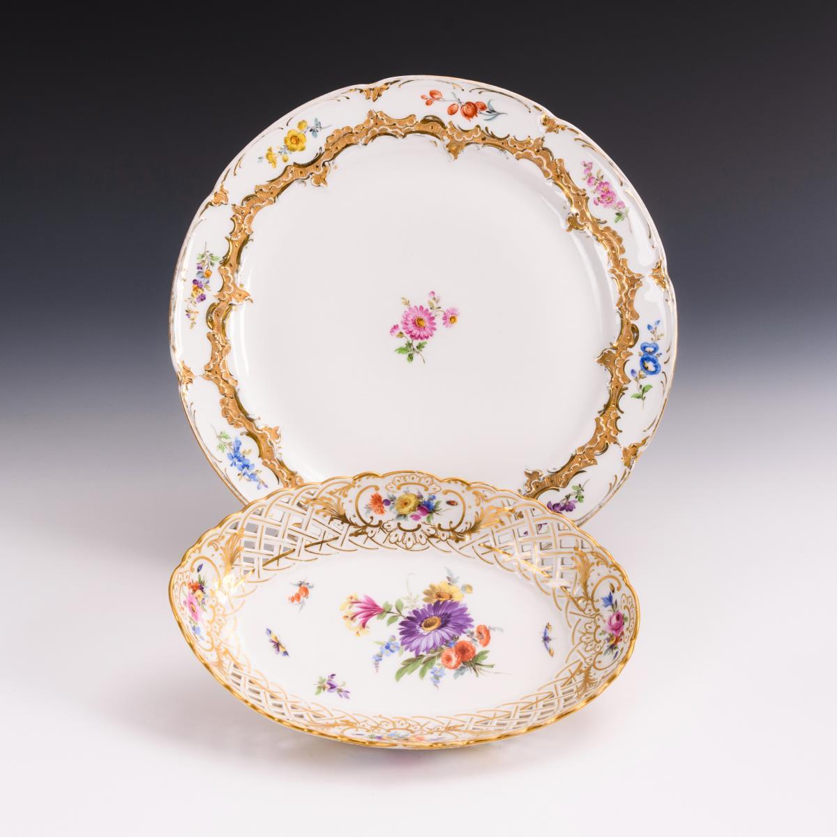 Kuchenteller und Durchbruchschale mit Blumenmalerei. Meissen.