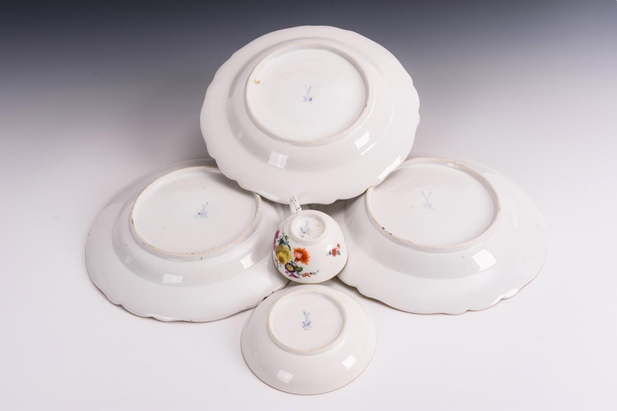 3 Teller und 1 Tasse mit Blumenmalerei. Meissen.