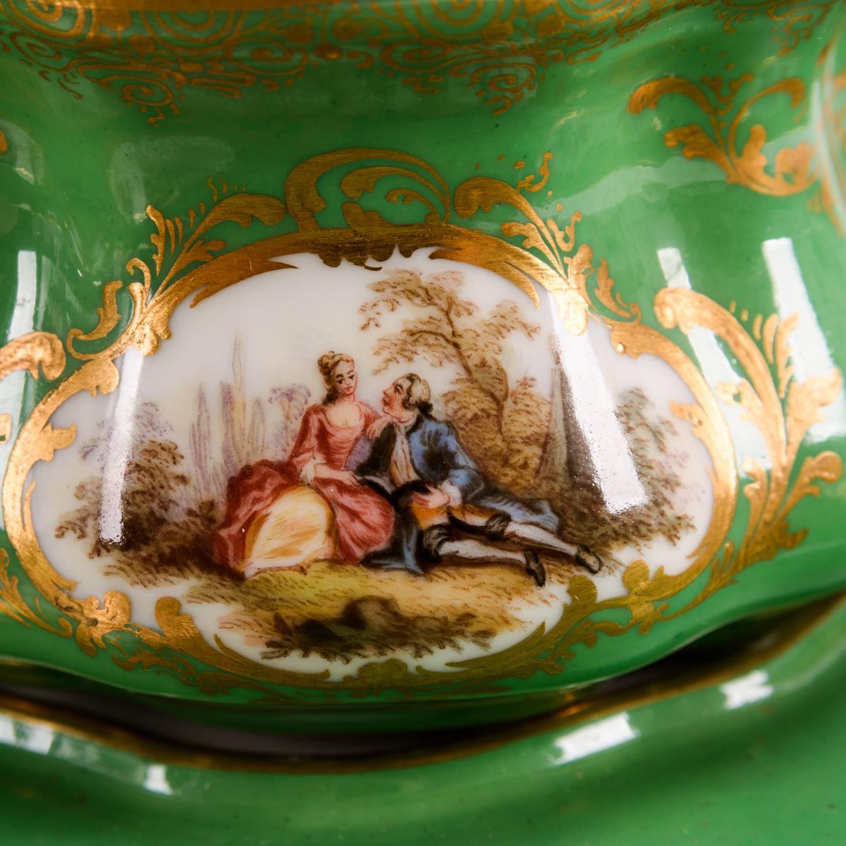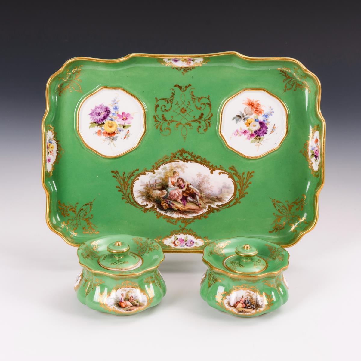 Grüner Fond, polychrome Blumen- und Watteaumalerei, Goldstaffage. Schreibschale (20 x 28 cm) und 2 Tintenfässer (H 6 cm).