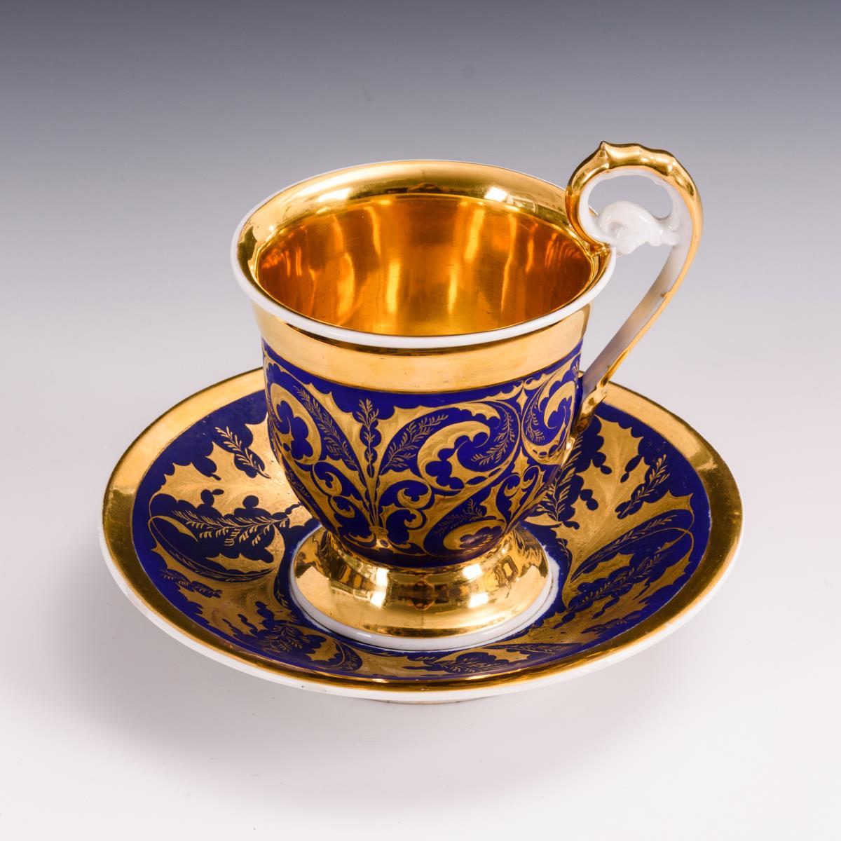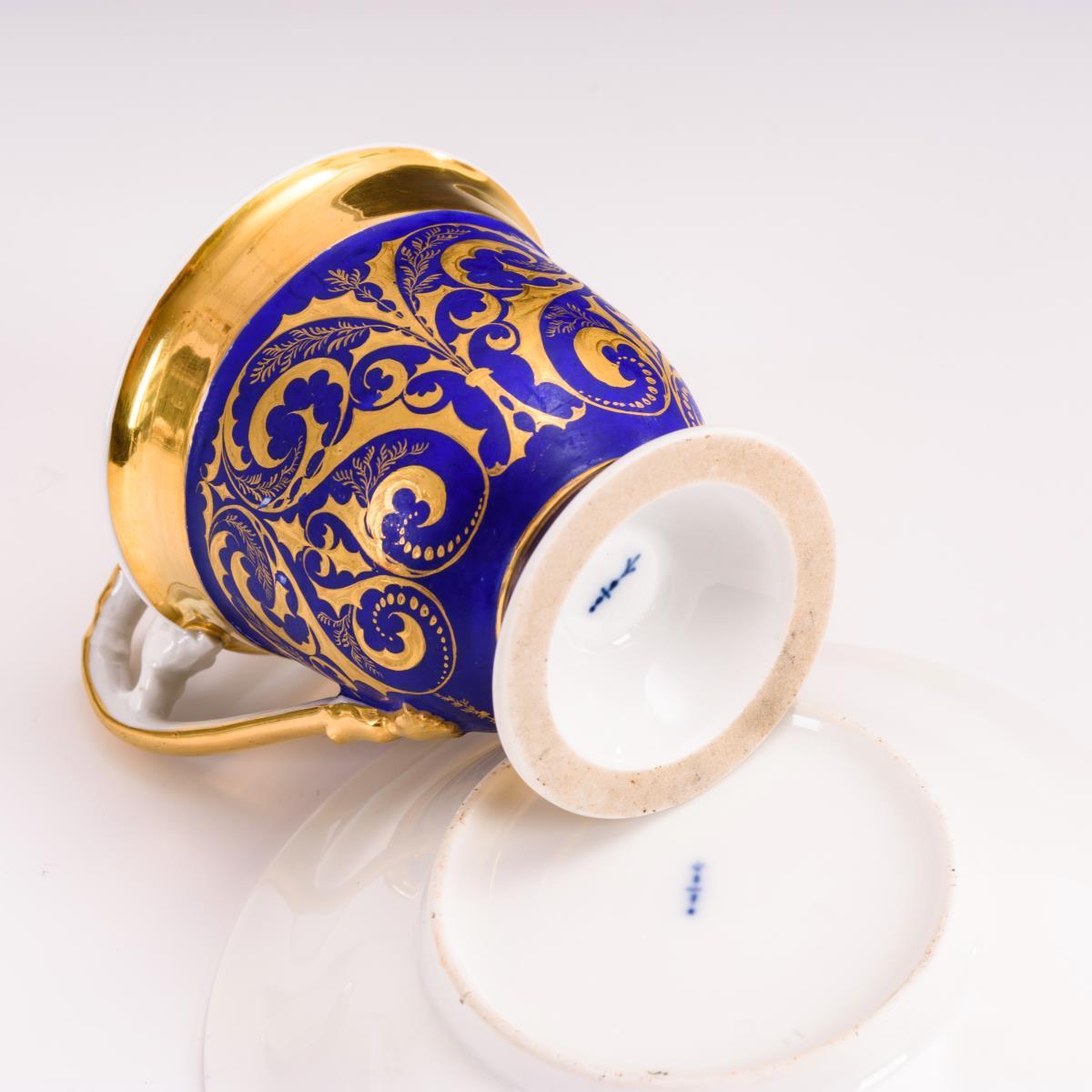 Goldradiertes Rankenwerk auf dunkelblauem Powderfond, innen vergoldet. H Tasse 11 cm, Ø originale Untertasse 14,5 cm.