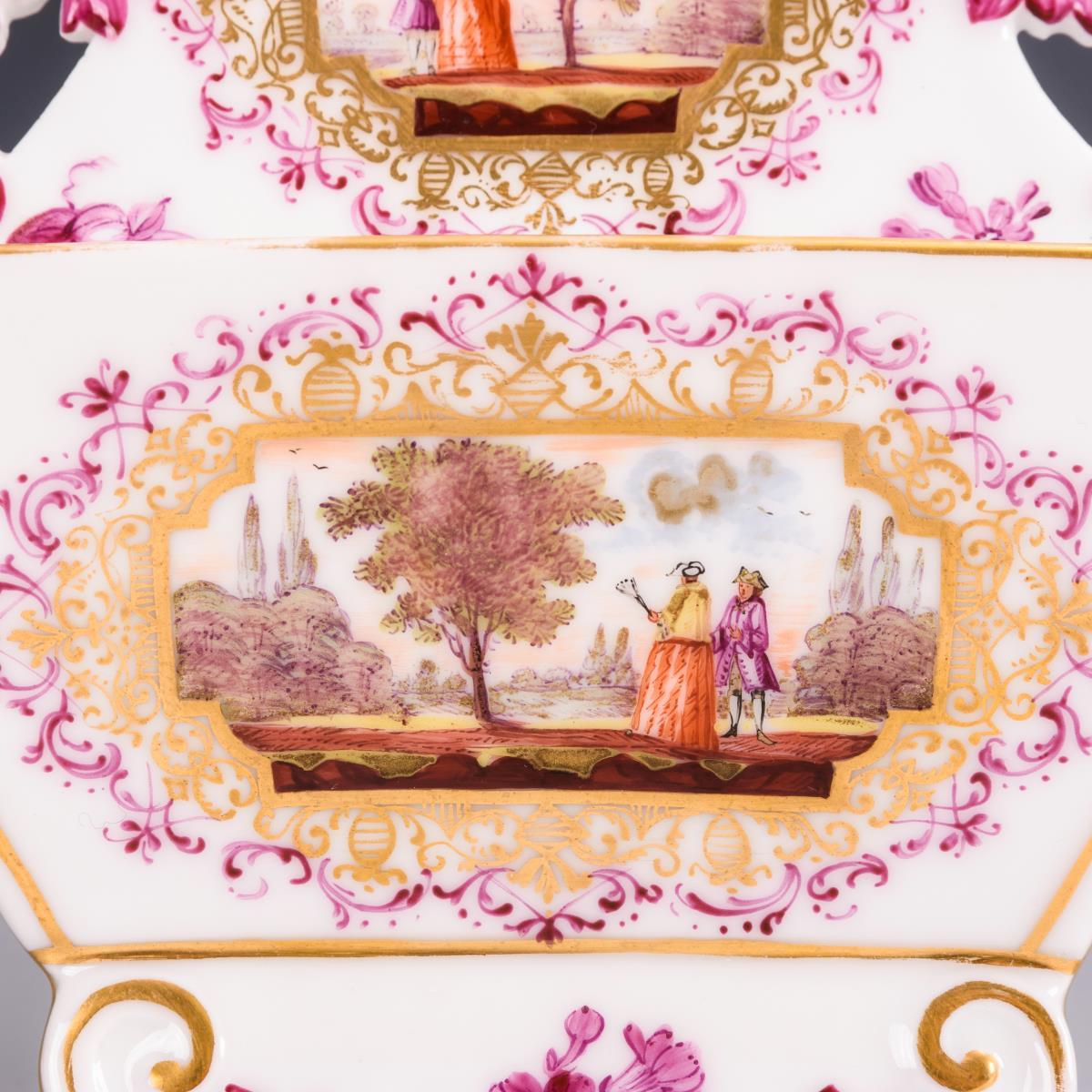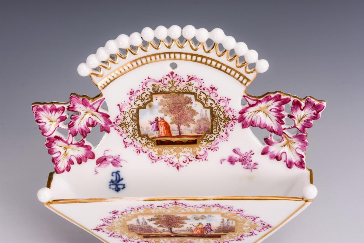 Konischer Behälter mit Blattdurchbruch und Kronenabschluss. Mit zwei ornamental in Purpur und Gold gerahmten Kartuschen, darin je eine galante Szene.